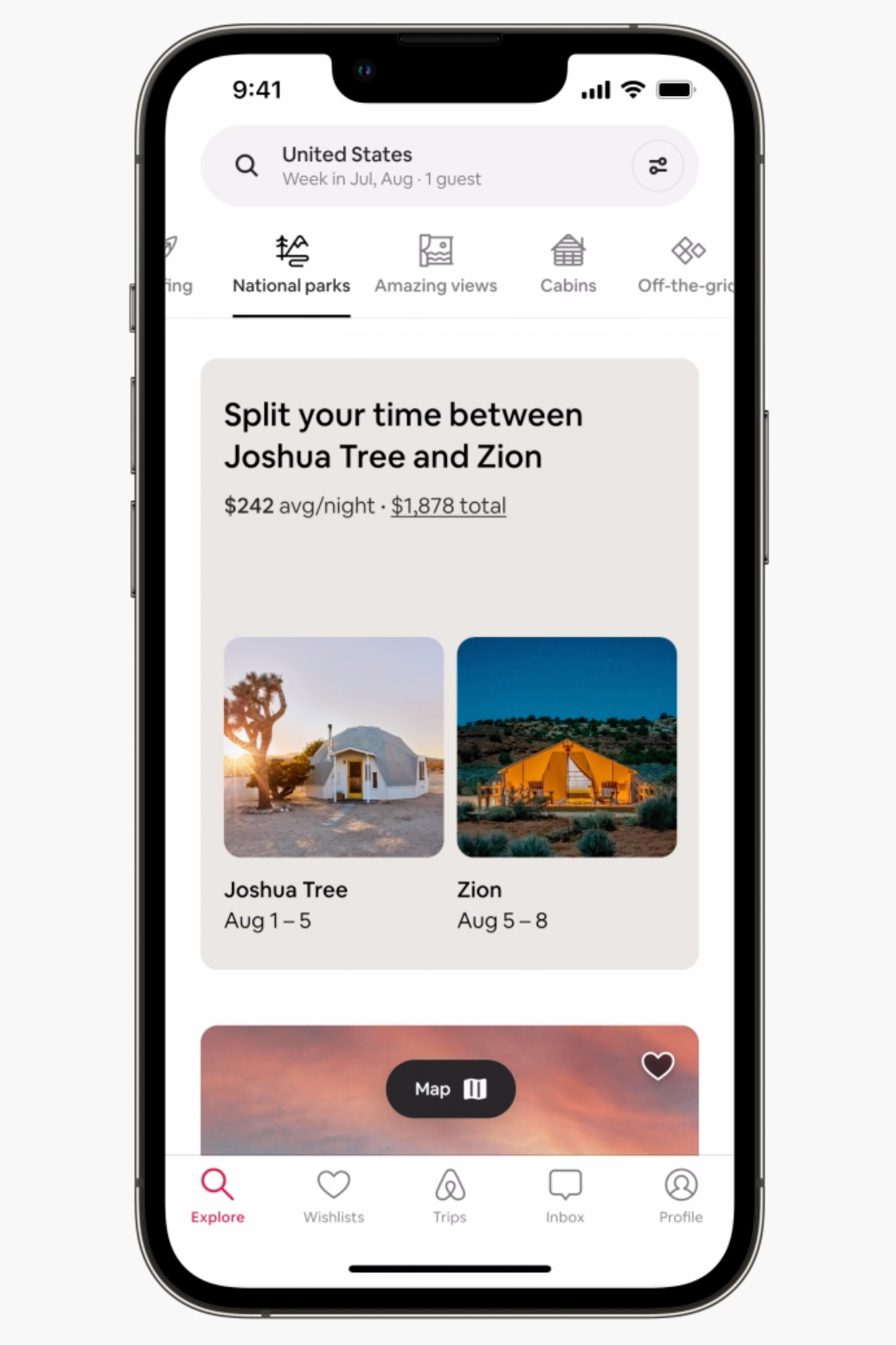 Split Stays is also offered in 14 different categories, including Camping, National Parks, Surfing, and more, so guests can enjoy similar homes or activities in two places. For example, a guest browsing the National Parks Category might find a Split Stay suggesting a home near Zion and another by the Grand Canyon.