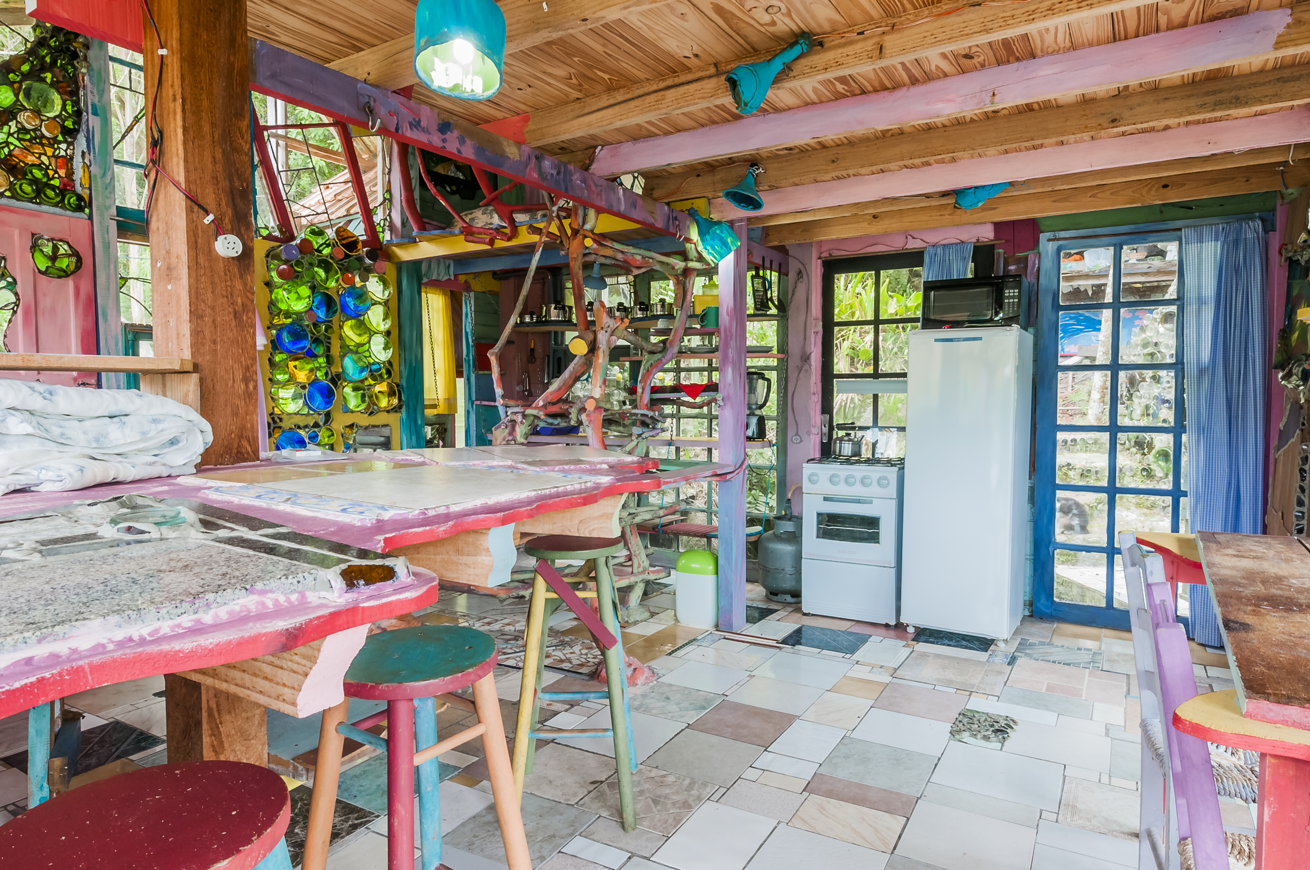 Esta cabana, construída com garrafas e vidro reciclável, transmite uma autêntica sensação de ar livre. Localizada no meio da natureza e perto de incríveis praias com água cristalina, este espaço rico em detalhes é perfeito para os amantes de arte.