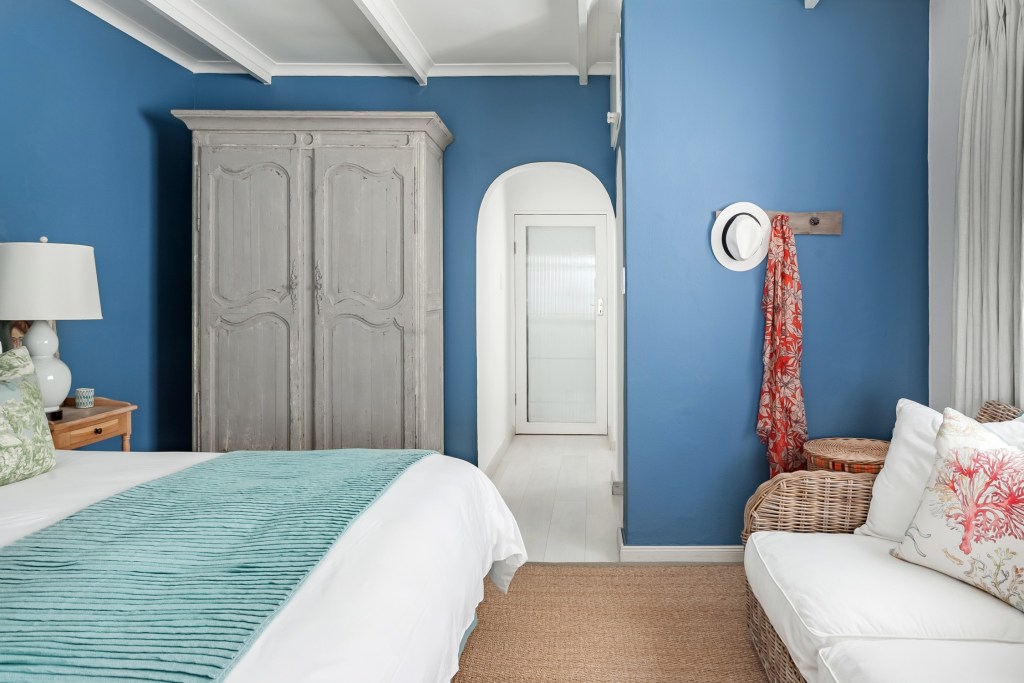 O interior branco com tons de azul deste alojamento, junto com a decoração com detalhes em madeira e fibra rattan de estilo boutique, vai transportar os hóspedes para o mar Mediterrâneo. Mas, ao cruzar as portas de estilo francês que levam ao terraço, poderá desfrutar de um espetacular pôr do sol e sentir a magia da África do Sul.