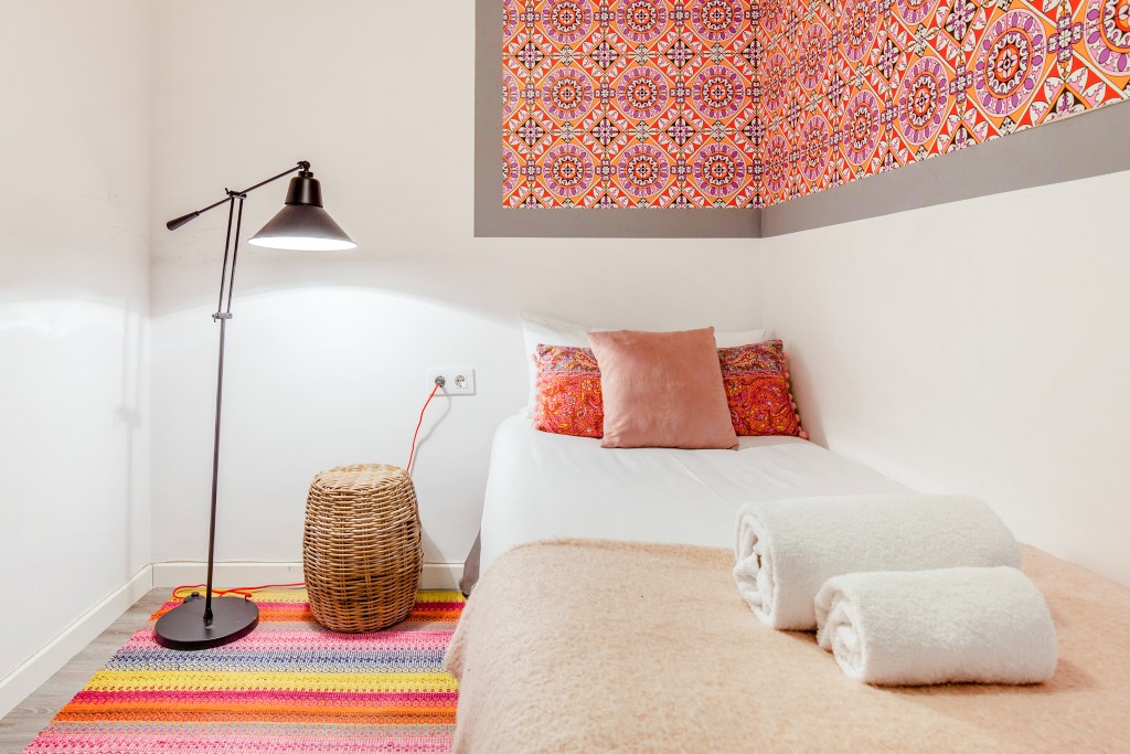 Este apartamento enorme com cores coordenadas próximo da Sagrada Família pode alojar oito hóspedes. O mais pequeno dos quatro quartos é também o mais elegante: as cores claras e o branco são aqui realçados com detalhes intensamente coloridos. Por conseguinte, a cor Pantone do ano também pode ser vista nos bonitos acessórios em cima da cama, nas almofadas estruturadas e no tapete. É acolhedor cair na cama depois de um dia agitado na cidade.