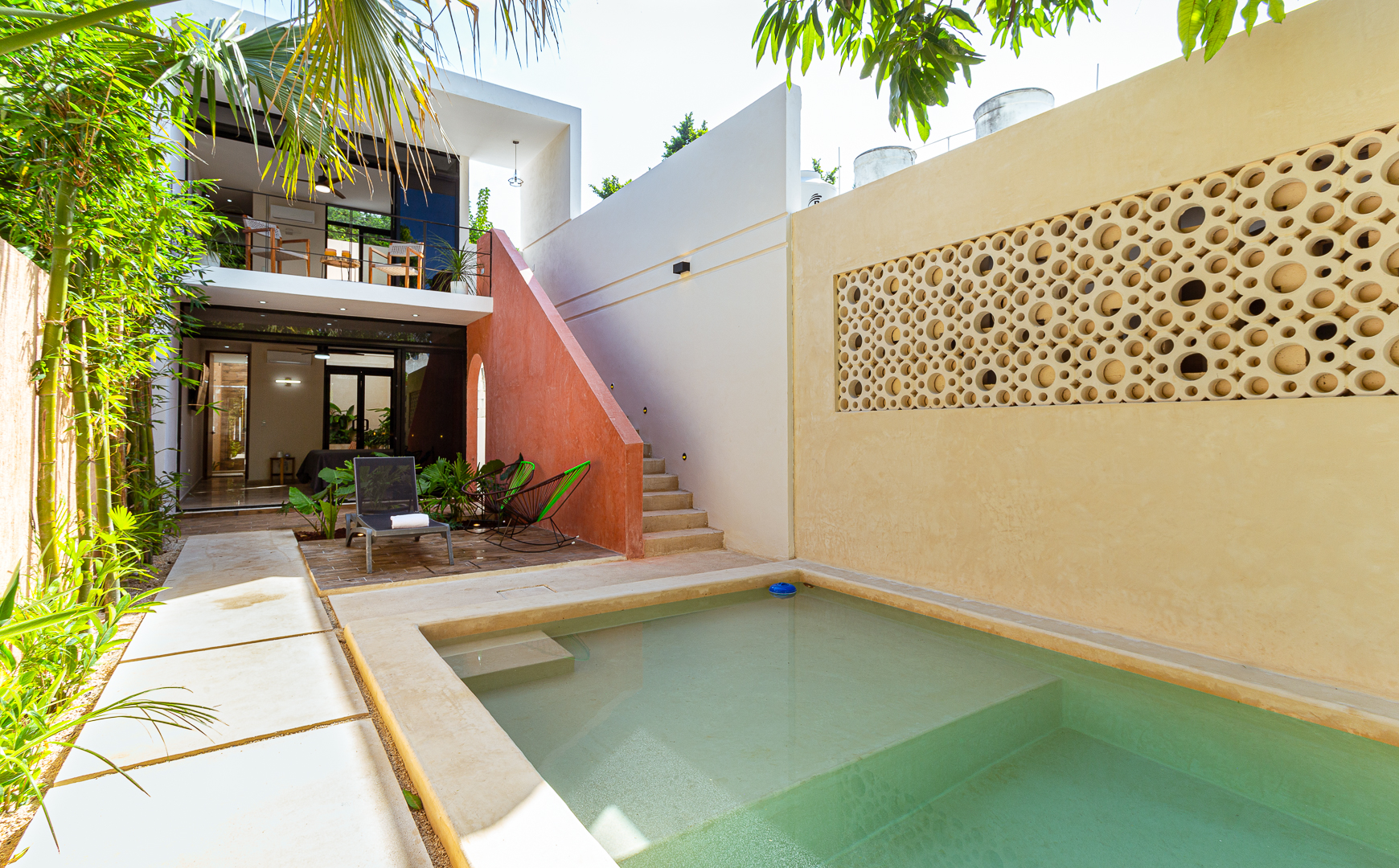 This colorful home is located in the center of Mérida, but with a stunning pool and private garden, it offers its guests total relaxation and tranquility. Once guests enter the home, they’re greeted by gleaming natural light that emphasizes the modern design and cozy atmosphere. The sleek kitchen and dining area are ideal for guests looking to unleash their inner chef, and the contemporary architecture makes it a must-stay for design enthusiasts.