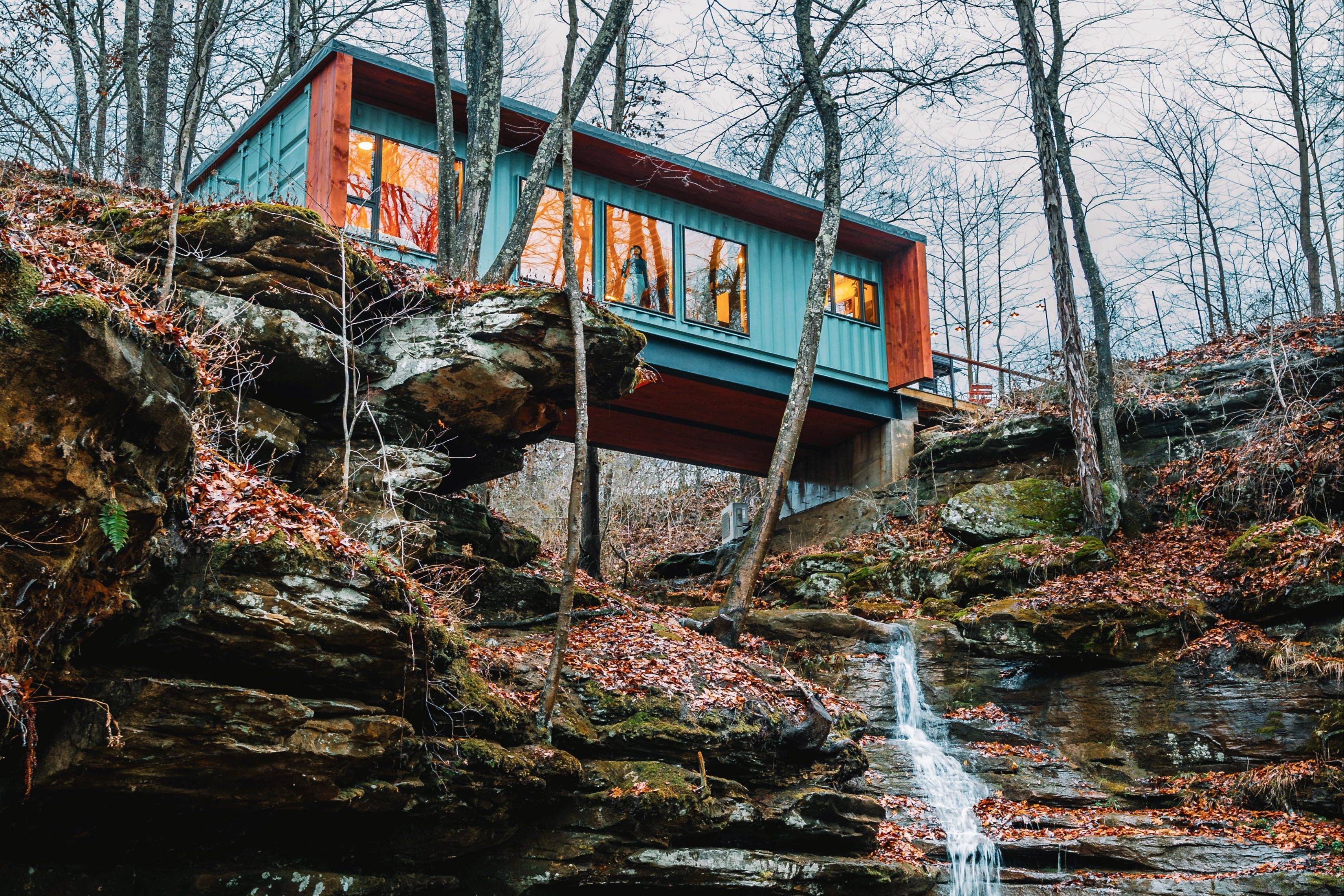 This single-story, minimalist shipping container cabin was designed to span a ravine that sits directly over a waterfall. Guests can even get a bird’s-eye view of the nature below through the glass floor in the living room. Its mid-century modern design offers a chic interior with vibrant decor. The stay is named after an influential Los Angeles designer of the 1970s, Craig Ellwood, who was known for his minimal steel and glass designs.