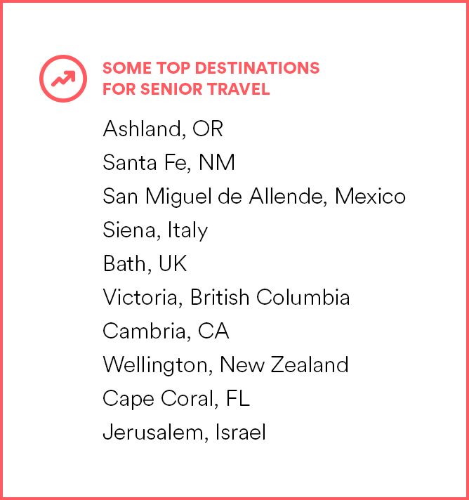 Senior travel is on the rise: Airbnb data shows that bookings by seniors increased 64 percent over the last year. For travelers over 60 from the United States, the most popular travel spots include Mexico, Italy, New Zealand and Canada, in addition to cities across the U.S.