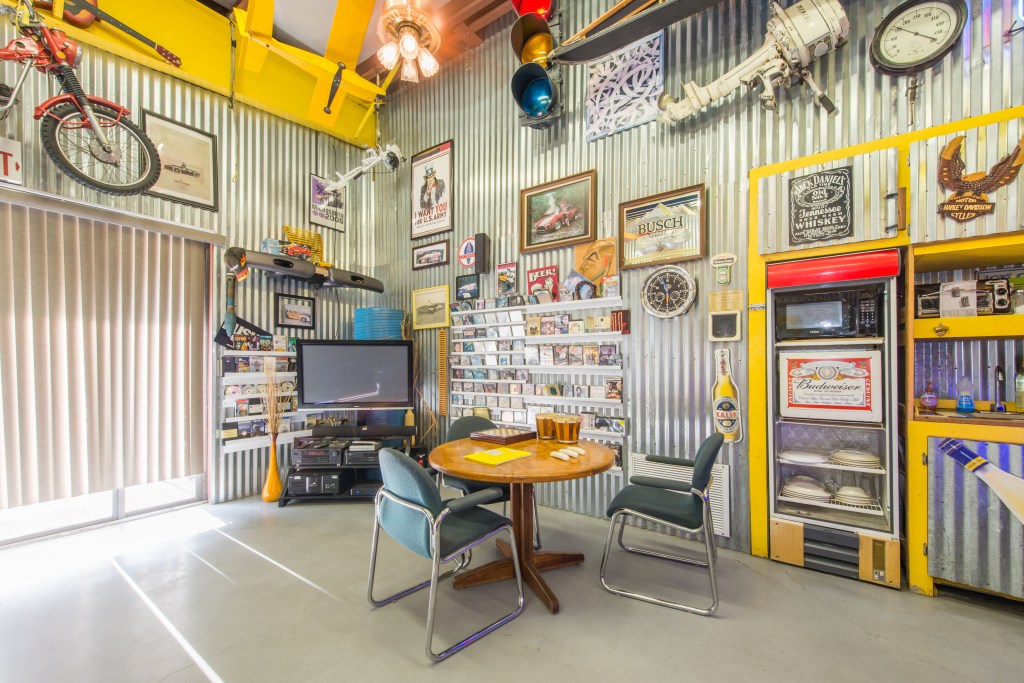 As part of an active airplane hangar, this eclectically decorated space offers you a unique living experience while the fireplace can be easily lighted up to warm up cold nights.