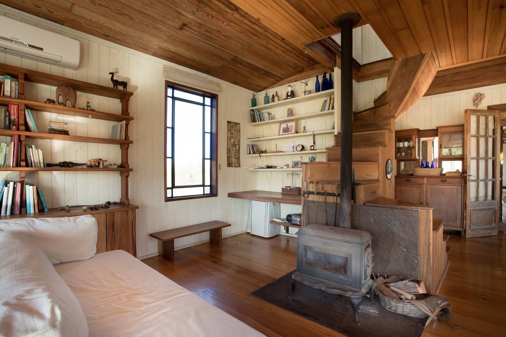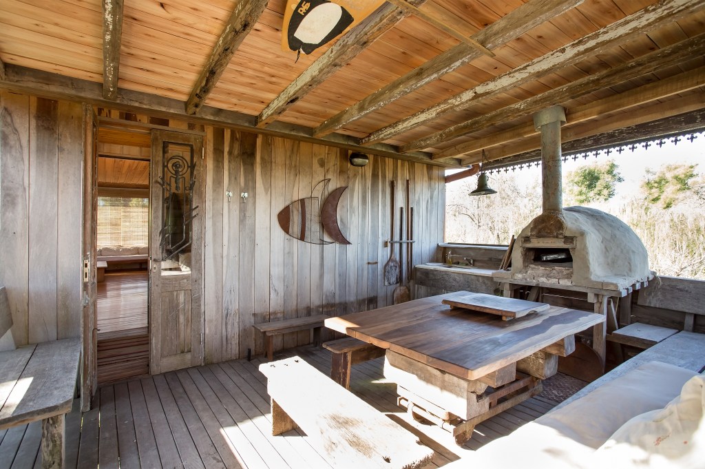 This wooden home is built upon several pillars, lifting it to tree-level heights to prevent flooding from high tides while also adding a loft-like feeling to the place. There is also a mud oven on the patio that is fully functional.