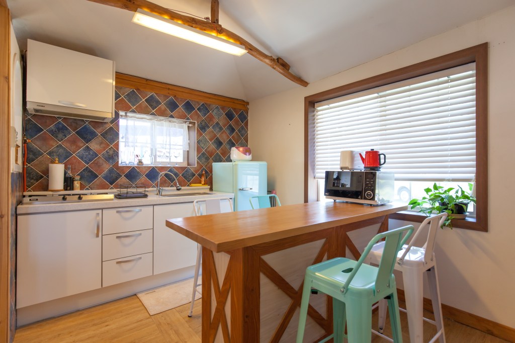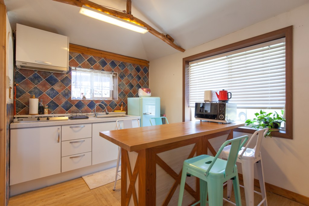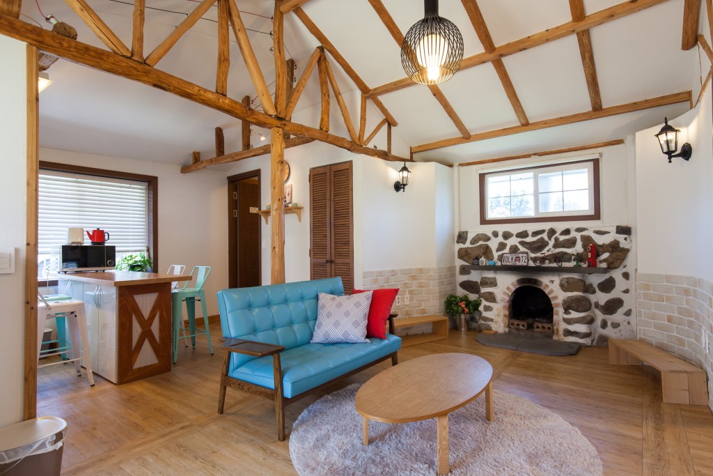 Find warmth in one of Jeju’s traditional stone houses that exudes both personality and coziness with its colorful furniture and stone fireplace.