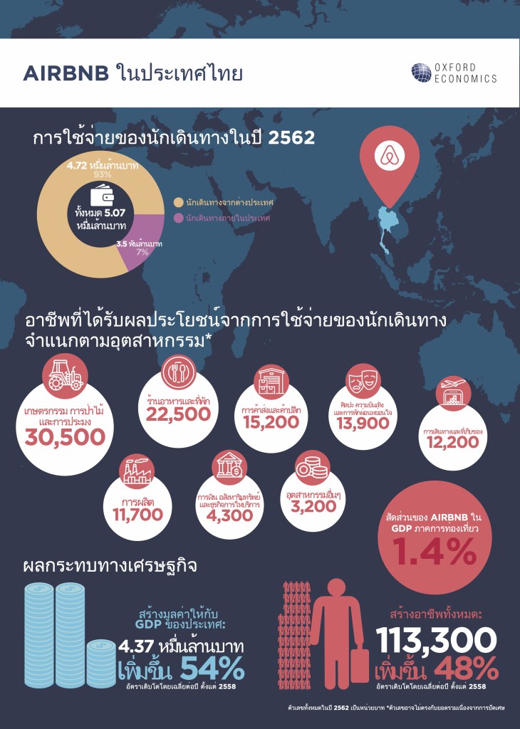 อ็อกซ์ฟอร์ด อีโคโนมิกส์ (Oxford Economics) สำนักงานวิจัยชั้นนำของโลก เปิดเผยรายงานผลกระทบของ Airbnb ต่อเศรษฐกิจในประเทศไทย (The Economic Impact of Airbnb in Thailand report) ในช่วง 5 ปีที่ผ่านมา (ปี 2558-ปี 2562) ซึ่งตอกย้ำว่า Airbnb ที่ชูโรงเรื่องท่องเที่ยวท้องถิ่นนั้นเป็นเครื่องมือสำคัญในการฟื้นฟูการท่องเที่ยวให้กลับมาแข็งแกร่งกว่าเดิม  โดยระบุว่าเมื่อปี 2562 Airbnb มีส่วนช่วยสร้างเม็ดเงินราว 4.37 หมื่นล้านบาทให้กับผลิตภัณฑ์มวลรวมในประเทศ (จีดีพี) และสนับสนุนการจ้างงานกว่า 113,300 ตำแหน่ง ซึ่งข้อมูลดังกล่าวชี้ว่า Airbnb เป็นกำลังสำคัญที่จะช่วยกระตุ้นอุตสาหกรรมท่องเที่ยวในประเทศไทยขับเคลื่อนฝ่าวิกฤตในครั้งนี้ได้