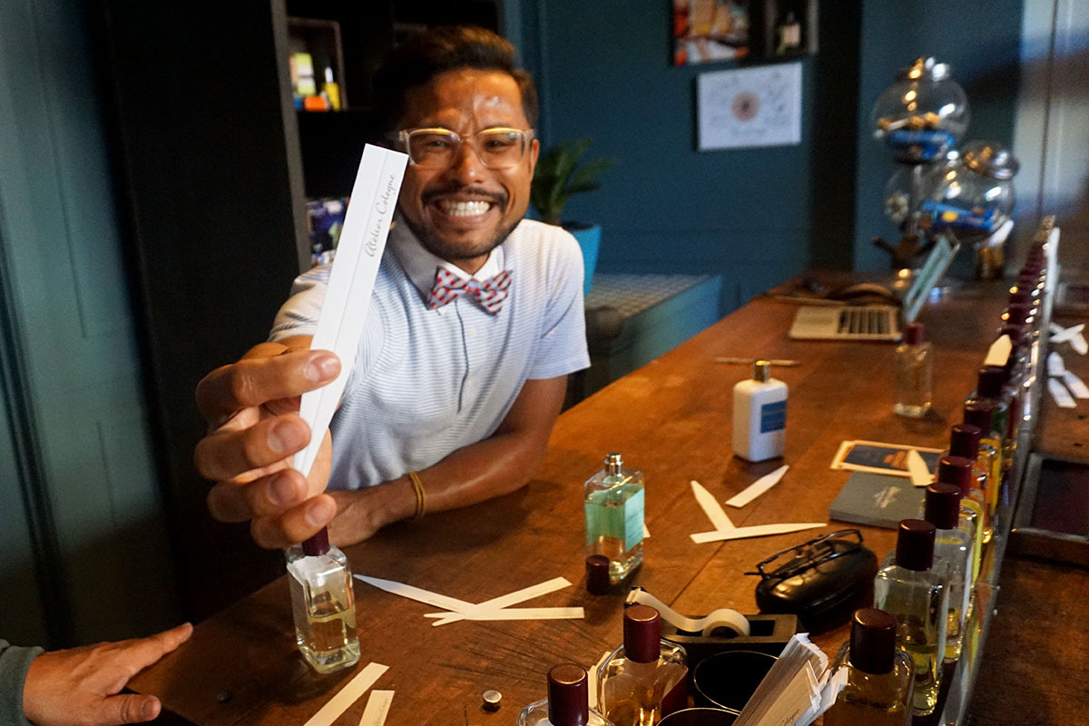 Homer De Ala walked hosts through Atelier’s scent-creation process and helped them sample perfumes and colognes. He told the stories behind the scents, many of which are based on memories: An outdoor breakfast with friends led to the creation of a rich, blood-orange-based Cologne Absolue.