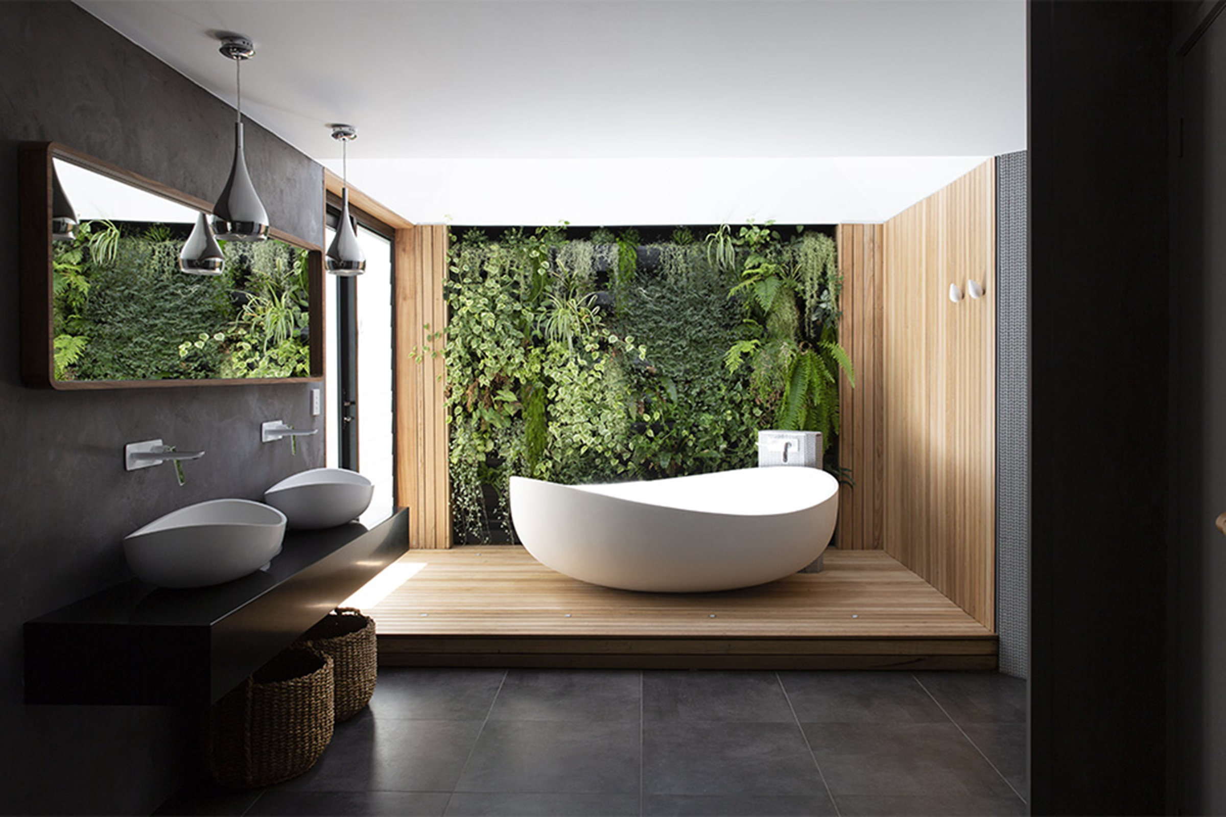Perched in the hills of Byron Bay, this secluded gem is filled with natural flora. Guests particularly love the master bathroom featuring a living green wall situated next to a large tub. Hanging plants, cactus, and fiddle-leaf fig trees are artfully placed throughout offering a tranquil and natural feel.