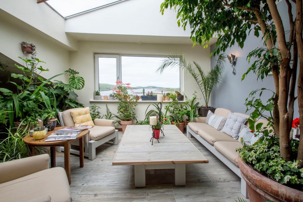 Overlooking the Ardbear Bay, this charming bed and breakfast features a light-filled sitting room filled with trees, house plants, and tropical flowers. Unwind in what feels like a solarium – the flora will help bring serenity to any vacation.