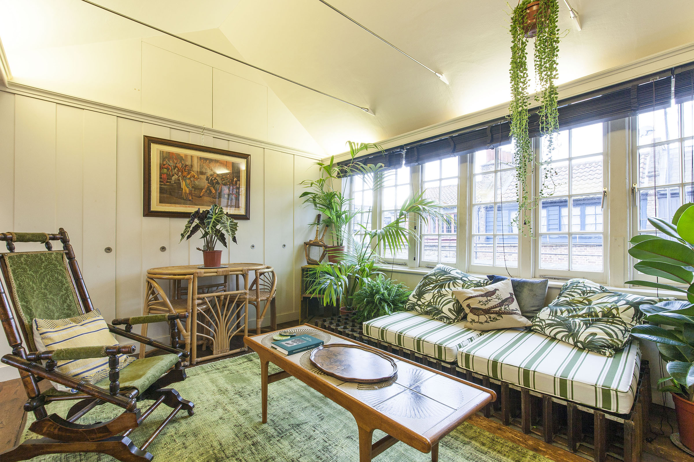 Fancy a cup of tea? Situated in a centuries old townhouse in London, this indoor garden mimics the beauty and colors of nature. Take a seat in the rocking chair in the cozy living room while enjoying this eclectic oasis.