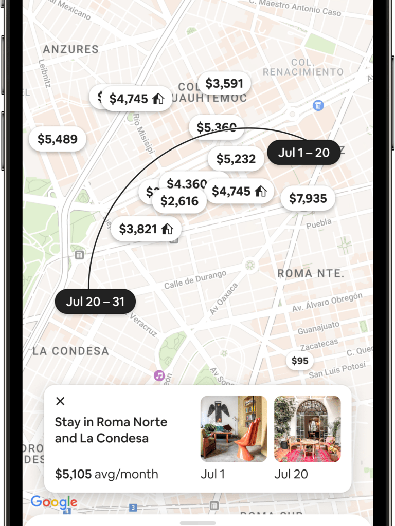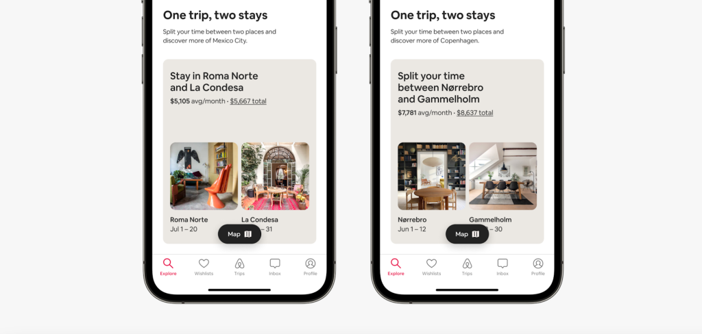 For added ease, guests can also view where both listings are located on the map, with a unique icon and an animated arc connecting the two stays. This not only helps to visualize the distance between the two listings, but also indicates which stay is their first of the two.