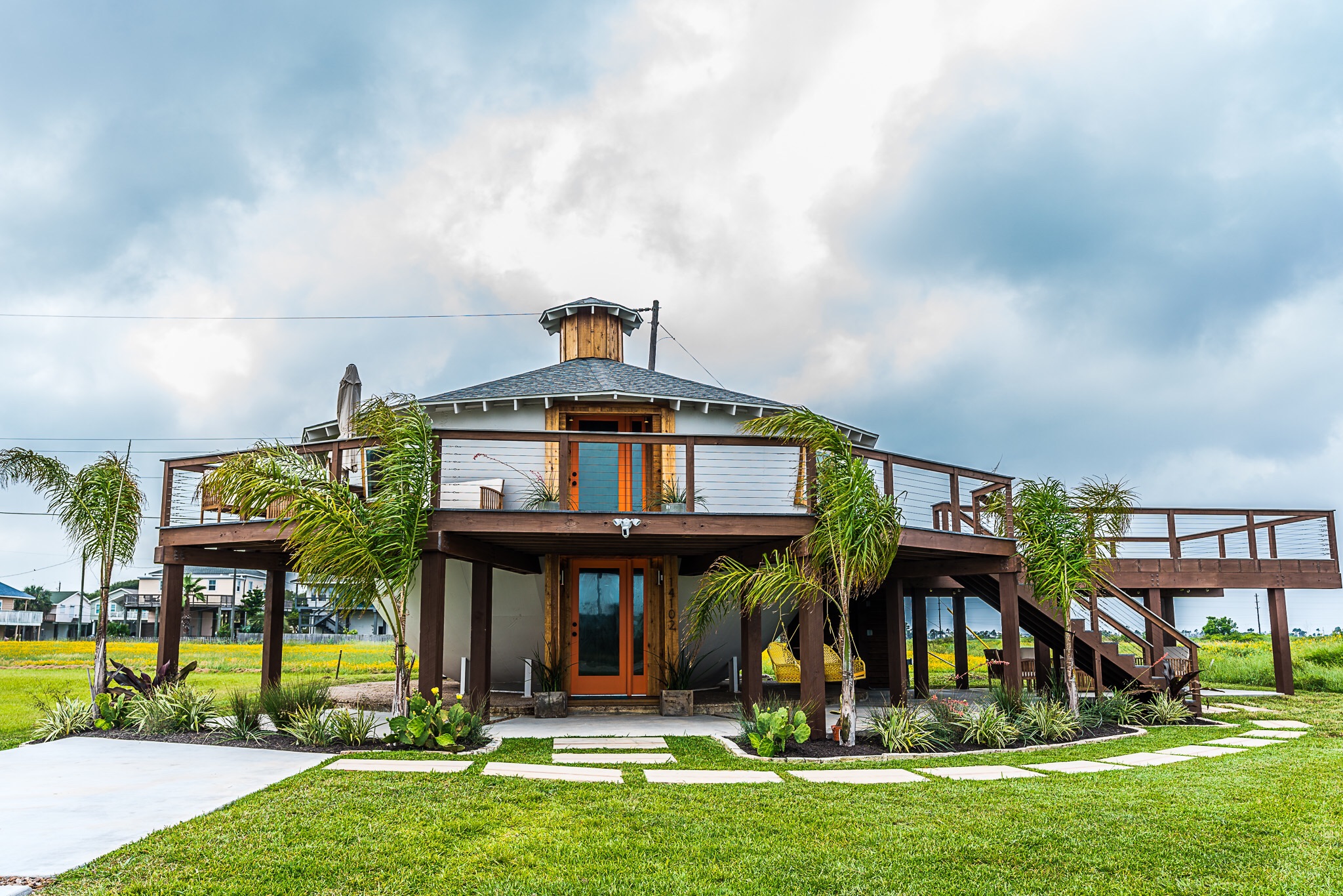 Woman in a striped button down shirt descends down the side steps of a renovated shipping container home with basket in hand. She's stepping out onto a gravel side yard with a fire pit and the home is situated on a grassy bluff overlooking the coastline.