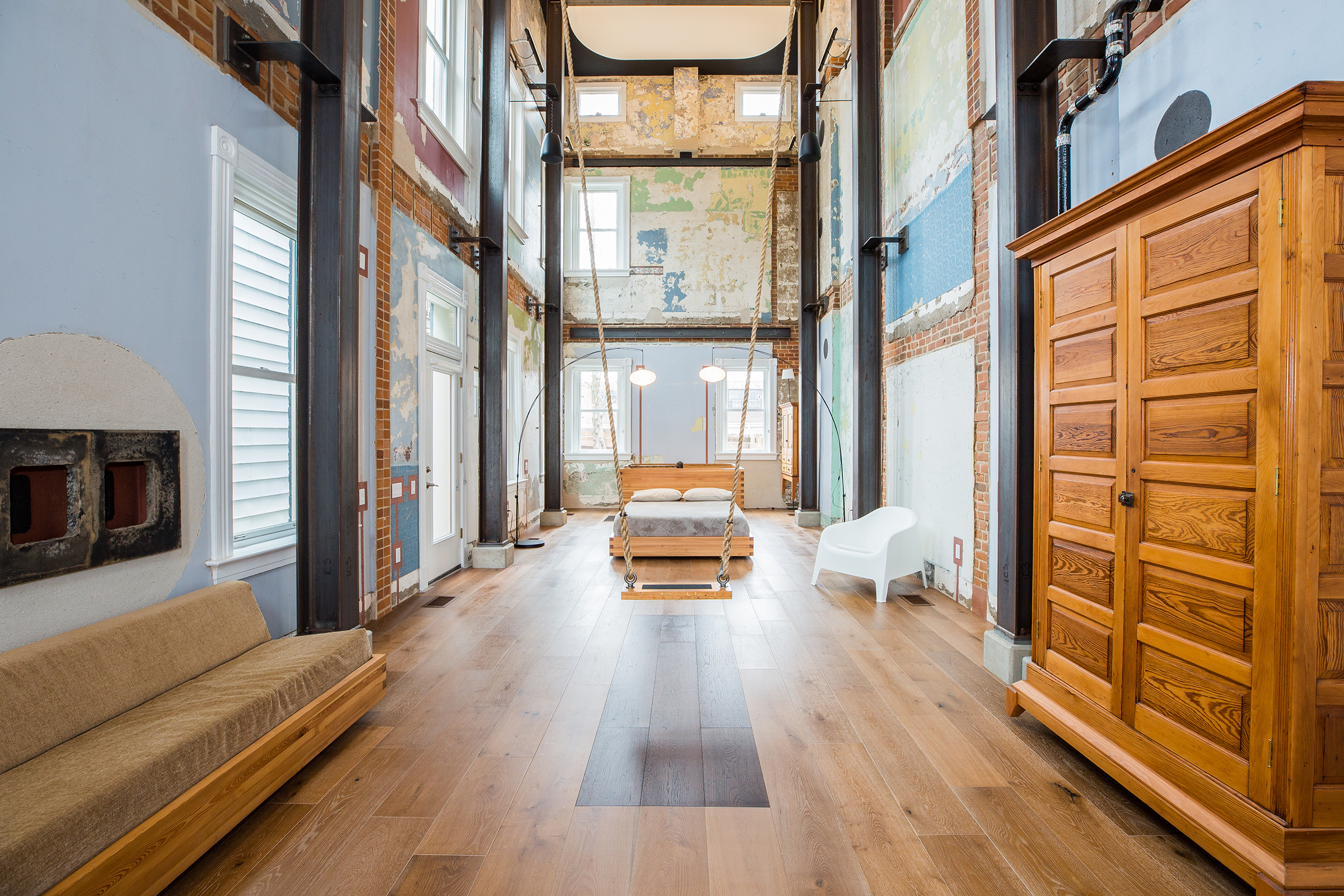 Toddler girl in foreground running towards camera on a front porch of an Airbnb. Her parents dressed in black casual clothes are watching over her in the background while enjoying their morning coffee.
