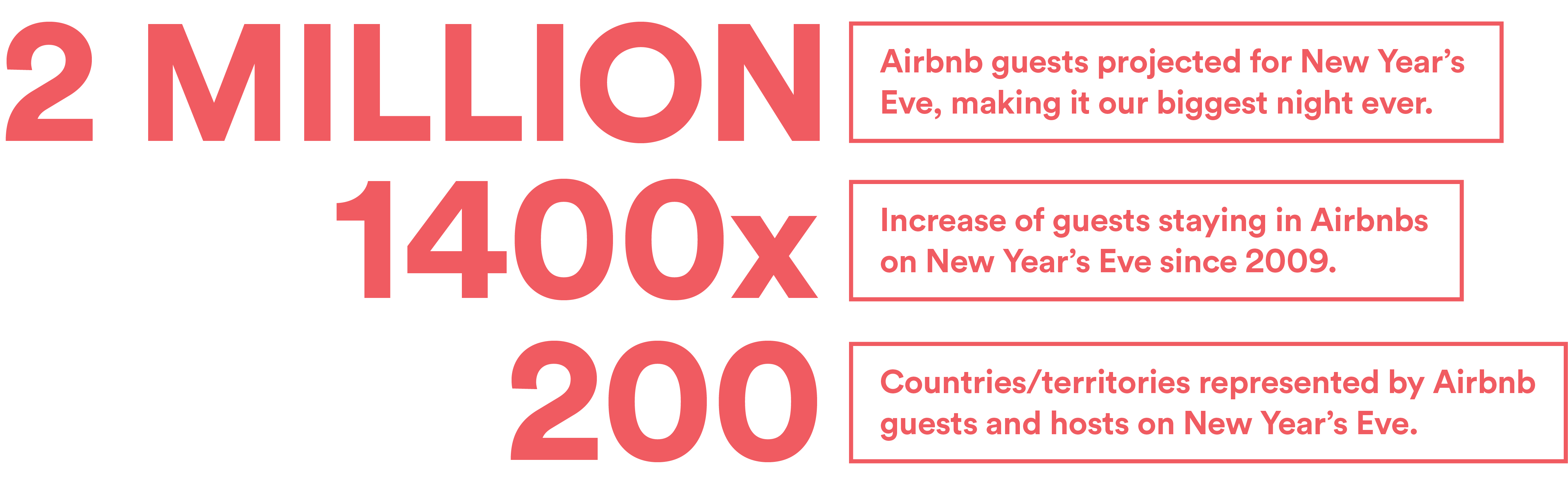 Airbnb will celebrate its biggest night ever this New Year’s Eve, projecting nearly 2 million guests around the world will ring in 2017 while staying in an Airbnb. That’s nearly double the number of guests who stayed in an Airbnb on New Year’s Eve a year ago, and an increase of 1400x since 2009.