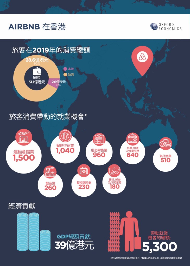 - Airbnb貢獻39億港元的本地生產總值,創造5,300個就業機會
