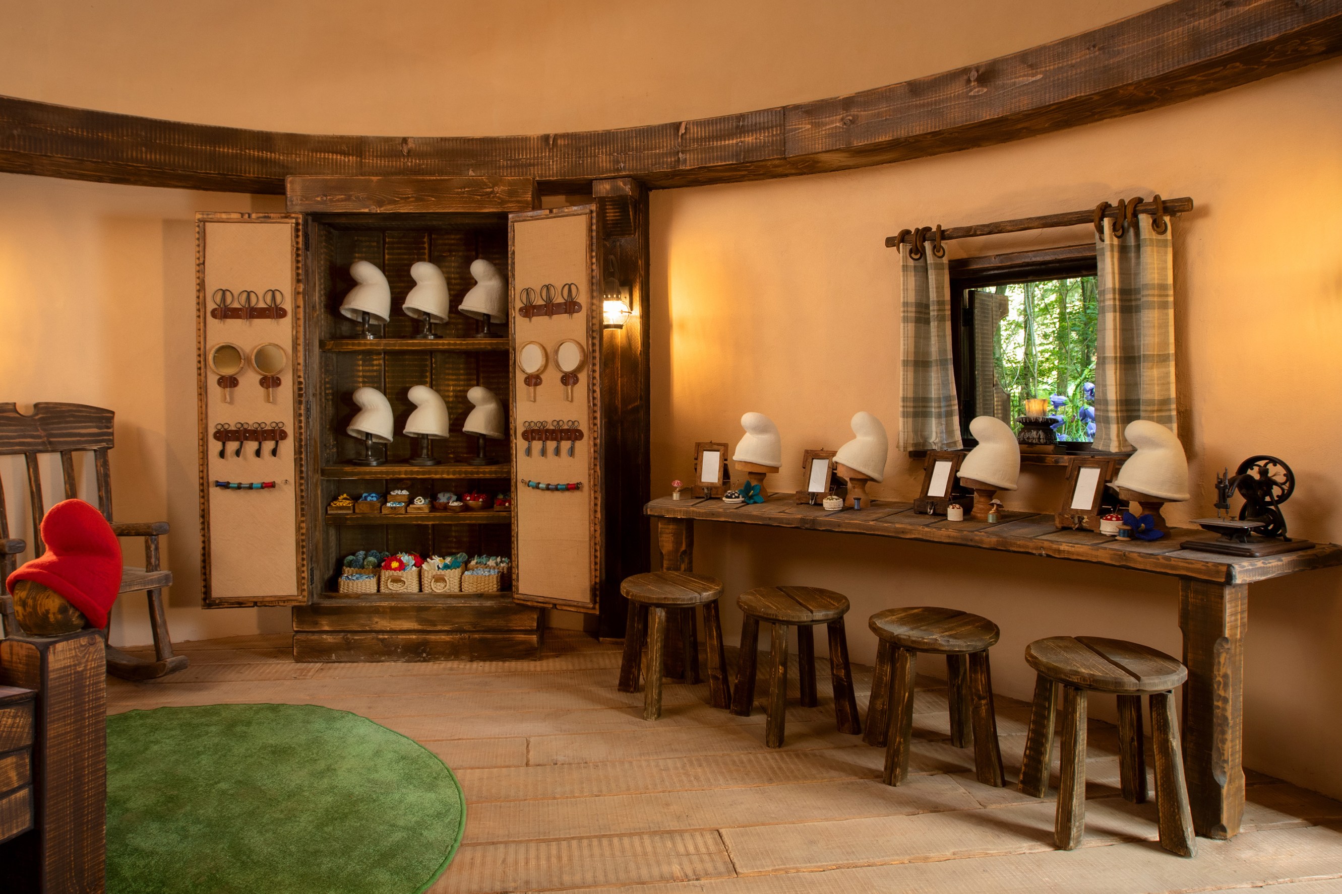 - 打造精灵帽:进入蓝精灵的家,围坐在蓝爸爸的圆桌旁,动手装饰属于自己的蓝精灵帽,今天一整天都要戴着它冒险哦(趁蓝爸爸不在家,还能一窥他家的样子)。