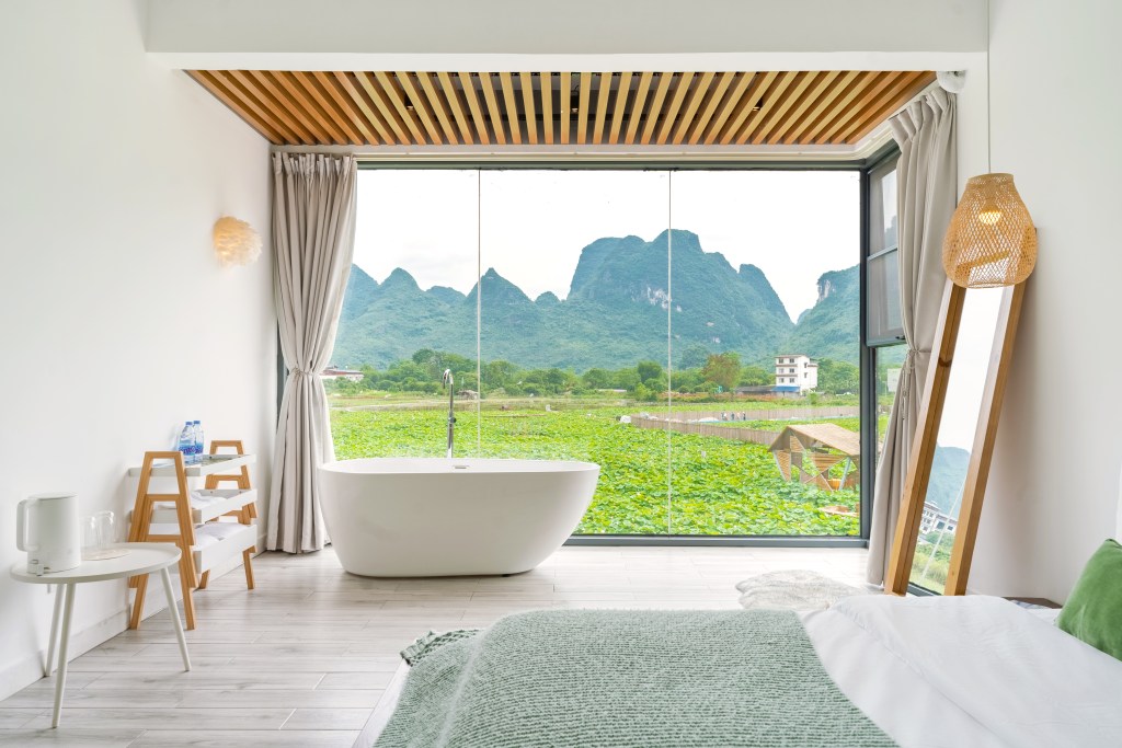 房东@Kenneth的民宿坐落在风景优美的遇龙河风景区,窗前大片的荷花径直延伸到远处的山脚下,真可谓是“睡在风景里”。城市里没有的宁静祥和,这里都有。白鹭时不时在门前逗留,牛群、鸭群从身边经过,或许闲适的它们才是这片天地的主人,而人们才是过客。
