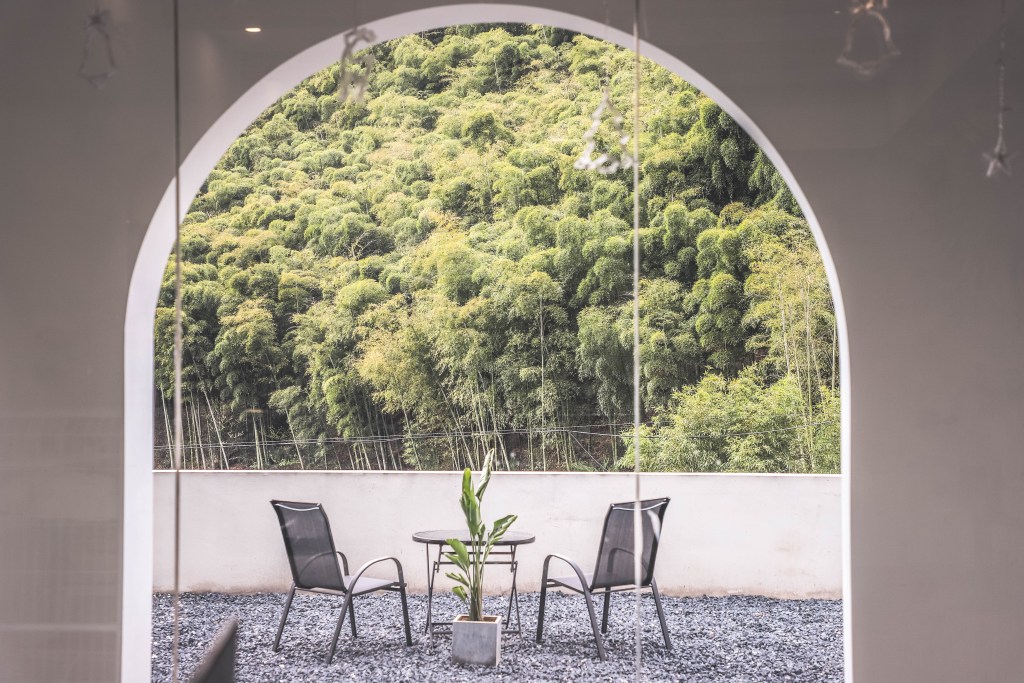 在茶园和竹林的中间,在山间小溪的旁边,坐落着莫干山房东徐的两幢小白楼。莫干山素来以竹闻名,这里的竹子挺拔、茂密、青翠、常绿、蔽山成林。而房间大大的落地窗则将这郁郁葱葱的山景剪切成画。清晨雾气初散,傍晚夕阳余晖,每一刻都美不胜收。