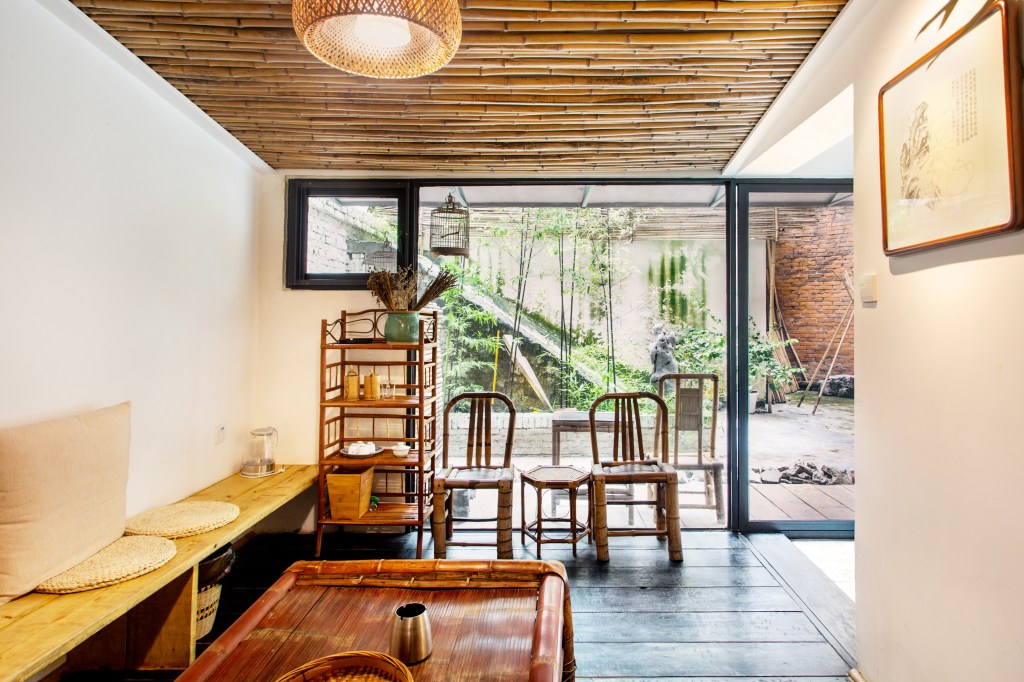 这座位于成都市武侯区的私家小院,竹子元素遍布目之所及。室内的桌椅、茶几、坐垫,甚至是置物架和吊顶均由竹子制成。庭院里种植的翠绿竹林,和室内遥相呼应。竹子材料的升级改造,具有当地特色的同时又充满传统韵味。