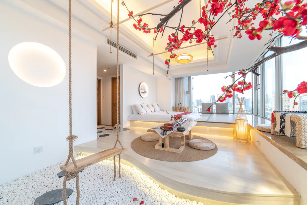 现代的房源内是古典素雅的汉风文化。房东在布景上用足了心思,四季常开的梅花造景、木制秋千、颇具古风的古筝围棋等装饰,让你全方位沉浸在汉风文化中,收获古典大片。