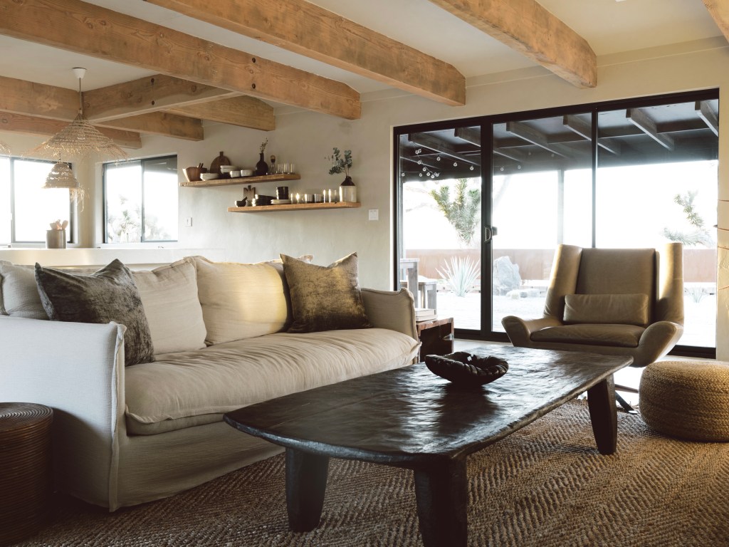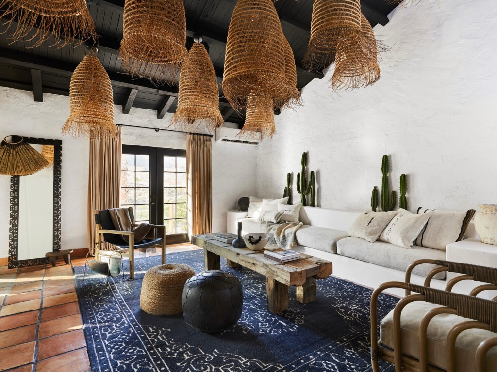 “黑色别墅”是一座中世纪牧场风格的房屋,最初建于20世纪60年代,经过精心改造后,它已成为了一个独一无二的“沙漠秘境”。受沙漠环境和日本的“侘寂(wabi-sabi)”理念的启发,房屋中的许多元素都采用手工建造并使用天然、可再生材料来展现质地和光线的微妙,镶边装饰和中性色彩调色板融合了多年来收集的古董。户外起居区让住客得以享受露天沐浴,感受人与大自然的神秘感应。