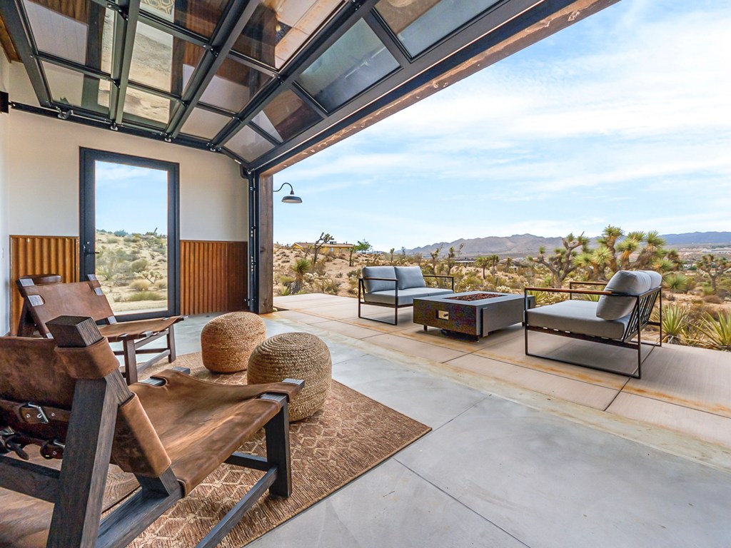 房屋坐落在郁郁葱葱的沙漠景观中。走进房源时,一颗巨大的约书亚树将引导住客前往电动汽车充电站。房屋内精致的室内壁画,由当地艺术家Ana Digiallonardo设计,可伸缩的巨大玻璃墙可以俯瞰下方的山谷,住进一间小屋,便可欣赏到卓越的人类艺术和壮丽自然风光相互交融的艺术氛围中。