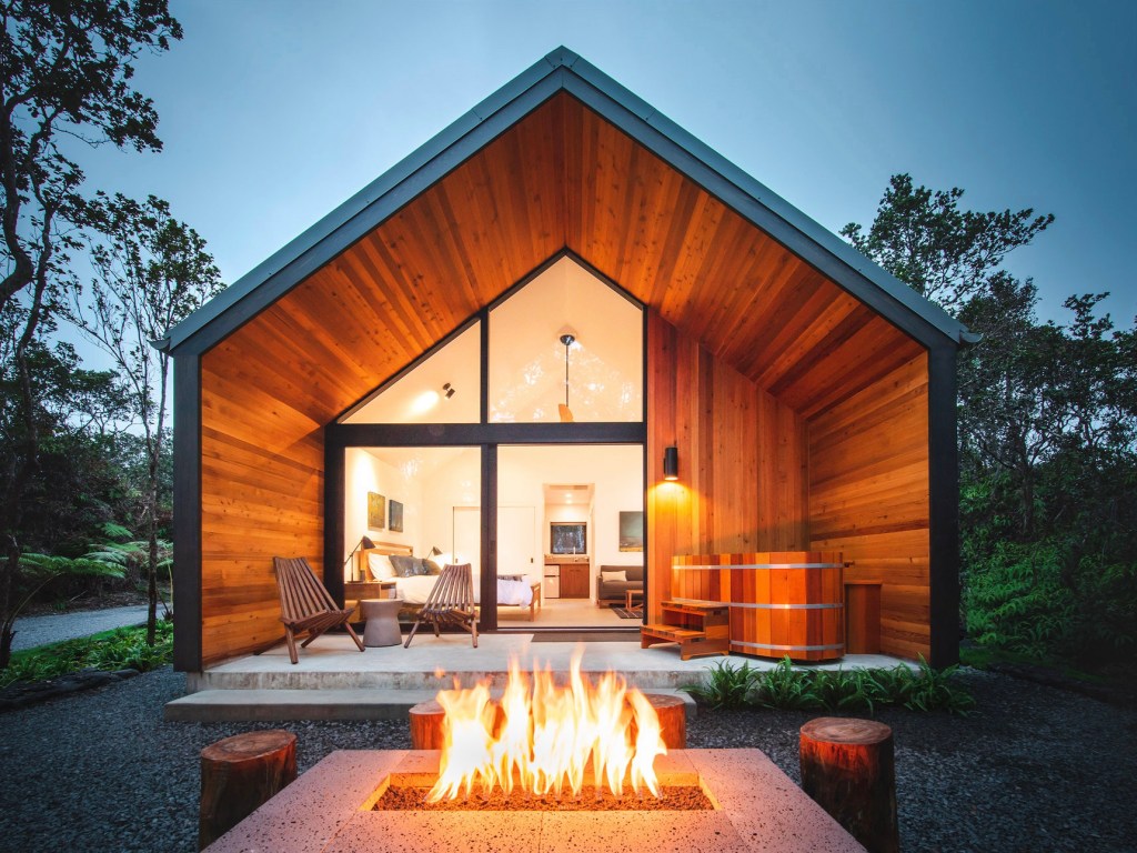 这是一座只需5分钟就能到达夏威夷火山国家公园的小屋,这座火山之旅小屋也曾荣获多个设计大奖。穿过如火山口的红色前门后,映入眼帘的是14英尺高的落地窗,窗外树林环绕的景色尽收眼底。房屋除了提供开放式概念的起居和睡眠空间以外,还拥有设有私人凉亭、躺椅和浴缸的户外空间。茶余饭后的傍晚在房屋周边漫步,一场火山脚下的奇妙之旅就此拉开序幕。