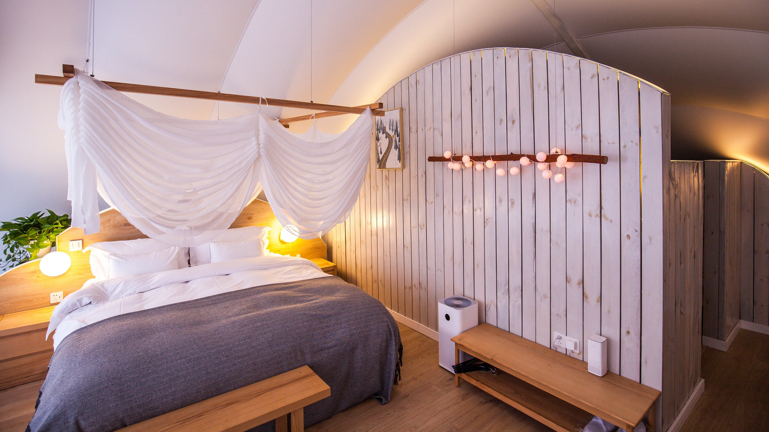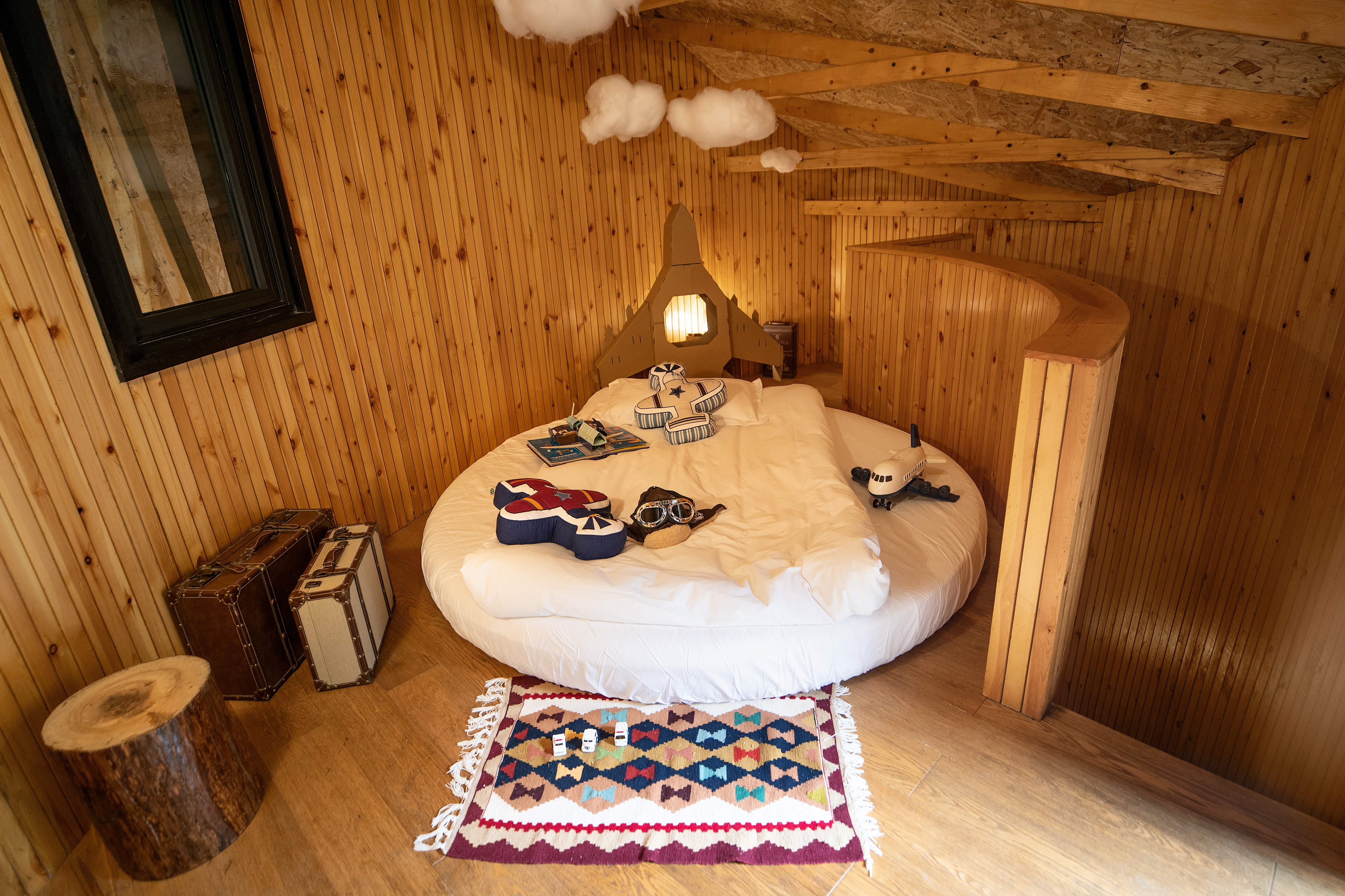 在拥抱森林、湖泊与花海的自然世界中,房东丛伟精心打造了树蛙部落里各式奇妙的房子。 这座鸟巢屋的整体外部设计,便借鉴了鸟巢的形态,其线条简洁而典雅,与天际线相映成趣。房间内布置的简洁舒适而又充满童趣,格外适合春季亲子出游。