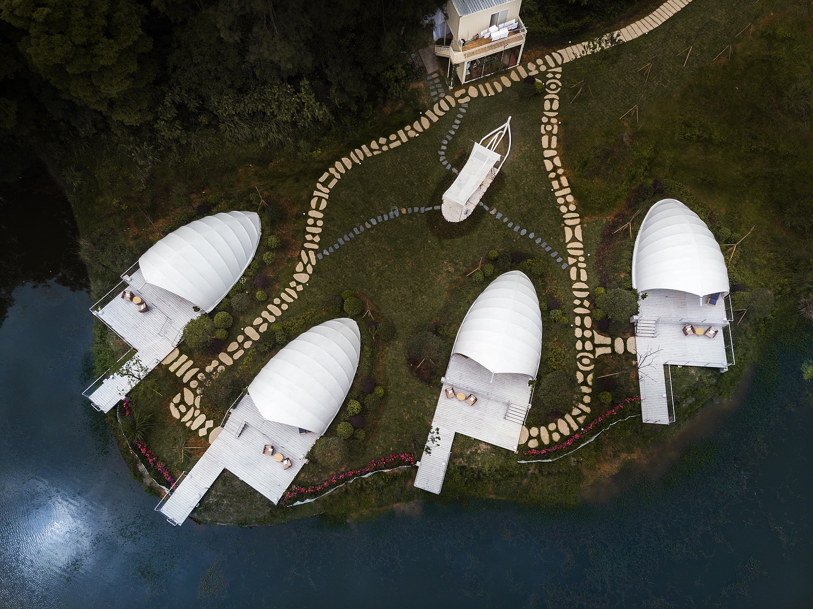 一枚枚白色贝壳的造型,点缀在绿意盎然的妙音湖畔,让民谣里的房源本身便成为了大自然的一部分。房东阿帆还为入住者们准备好了渔具、饵料等垂钓设备,坐在50平米的超大独立露台上,你可以在这里享受惬意的垂钓时光。妙音湖里的野生鱼类很多,有黄辣丁、鲫鱼、三角帆、黑鱼、花鲢等,为大家提供了了解鱼类物种的绝佳机会。