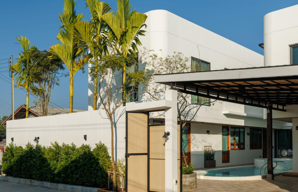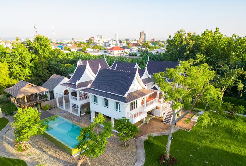- 湄平河畔的华丽泰式雅居:这座湄平河岸的泰北风格别墅,将兰纳建筑的经典韵味与现代度假体验完美融合。院内有一座百年谷仓改造的全木制庭阁,坐在其中,享受日落时分的一杯美酒,欣赏游船悠悠驶过。