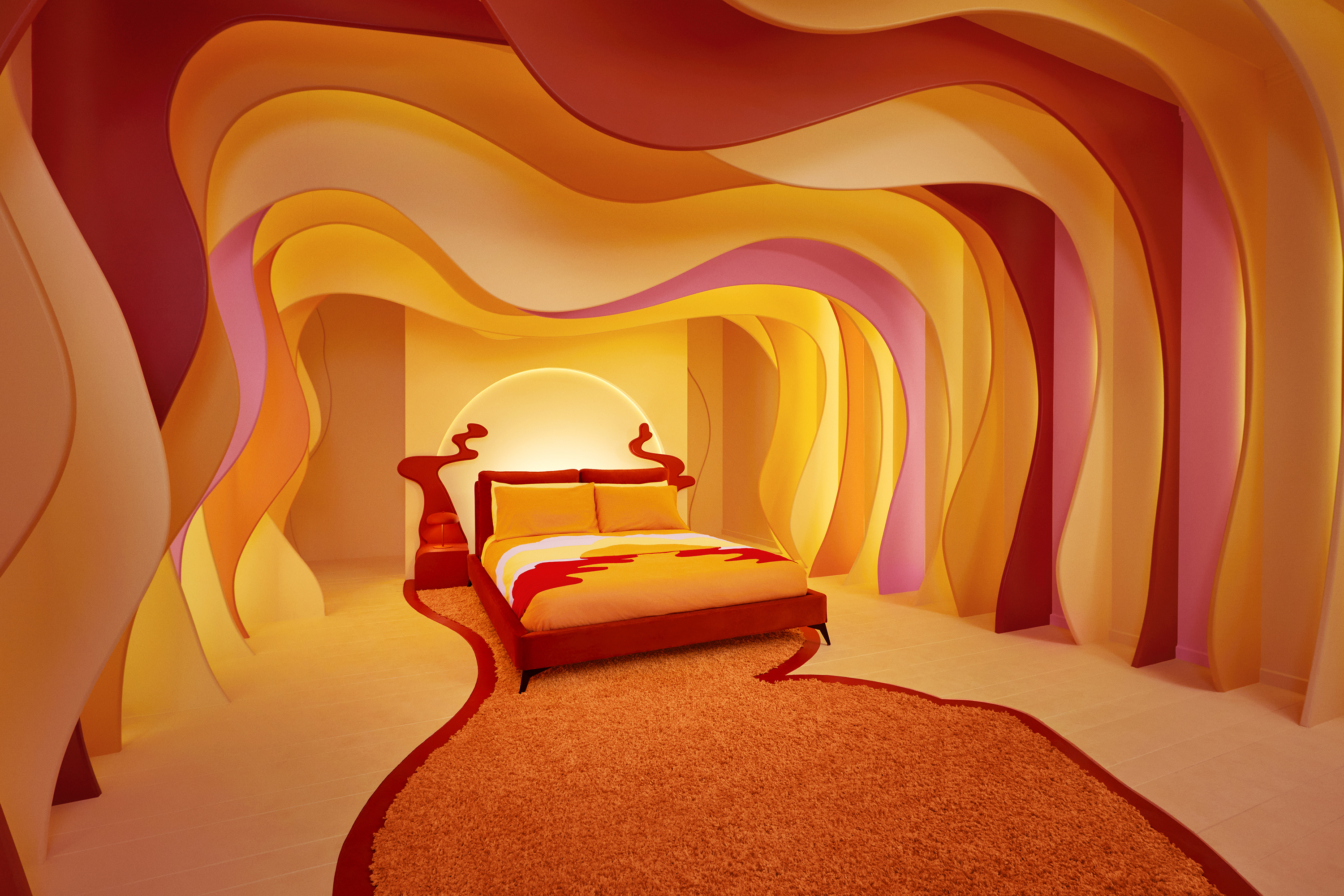 - 卧室的豪华大床被红橙波浪环绕,迷幻交织,似山似水,这明艳温暖的空间设计效仿了落日针织开衫上如夕阳融化般的绚丽色彩;