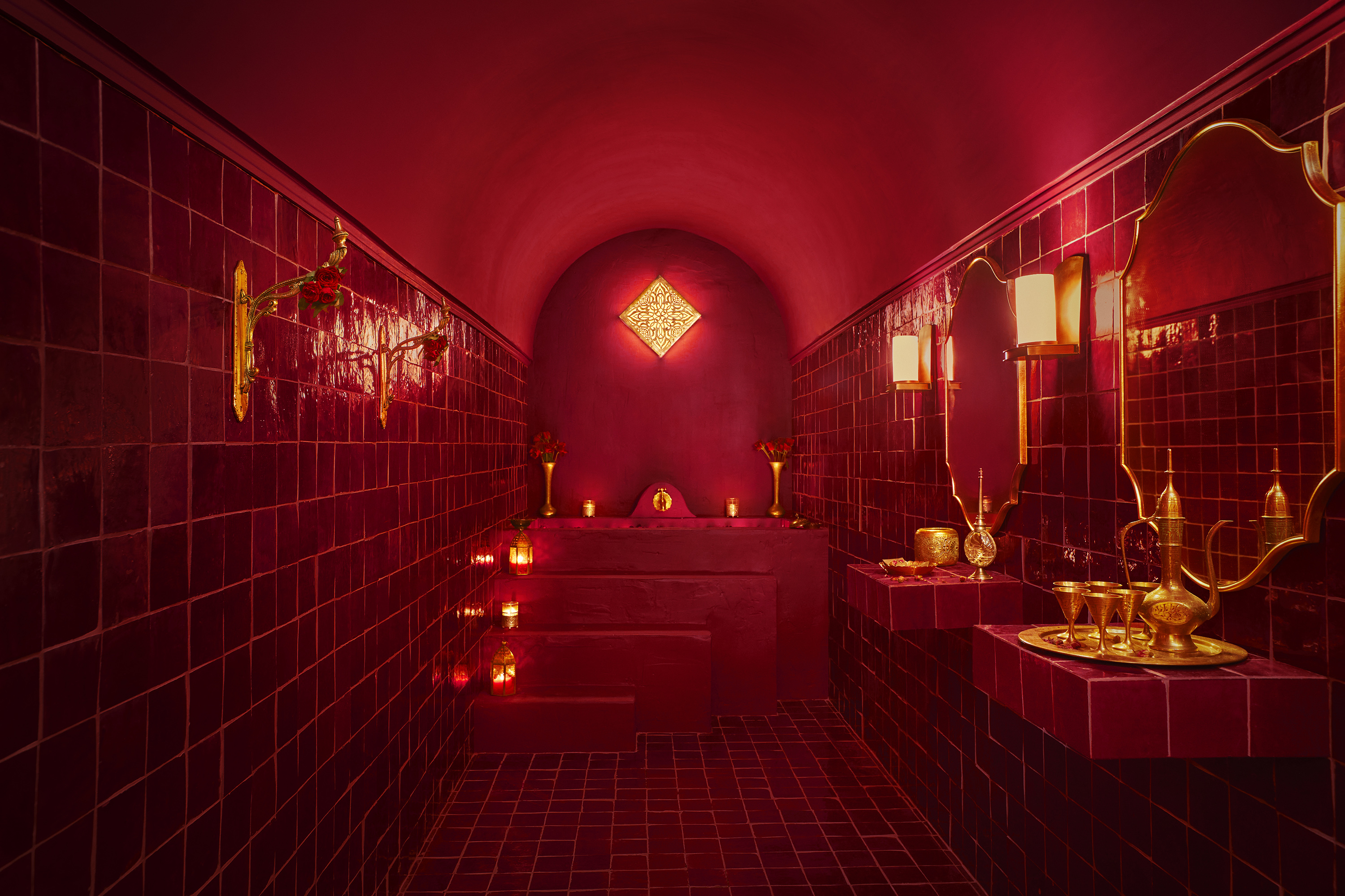 - 在奢华的红色浴室中洗去疲惫,整个空间铺满现代感十足的酒红色瓷砖,致敬品牌代表性单品La Belle印花裙。