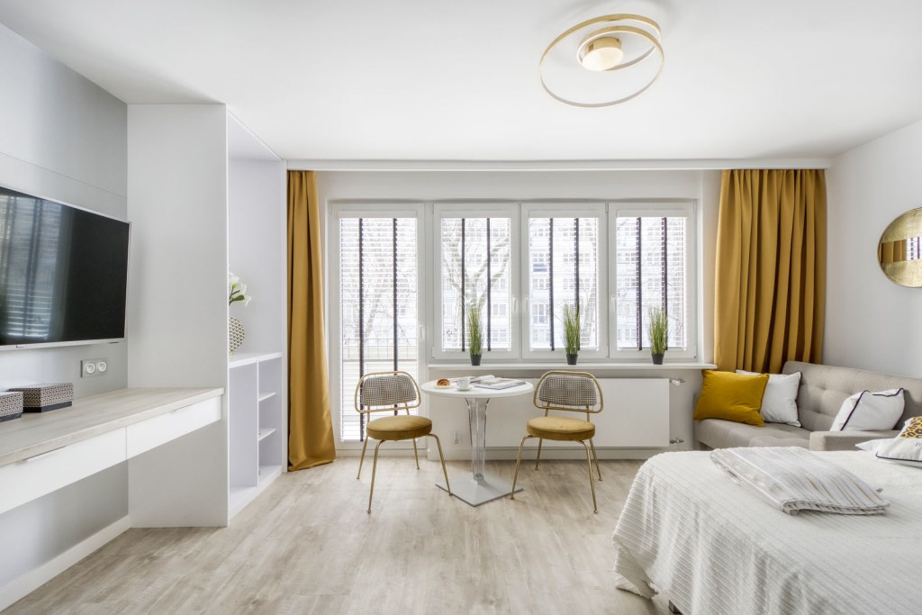 这间至多可容纳三人居住的现代公寓,与华沙最知名的标志性建筑之一“科学文化宫”隔街相望。这座建筑外观极其精致,装点着华美的马赛克及风格独特的雕像。其设计的宏伟壮观使它成为众多电影制片人钟爱的宝藏布景,是诸多影片里不为人知的“常驻演员”。