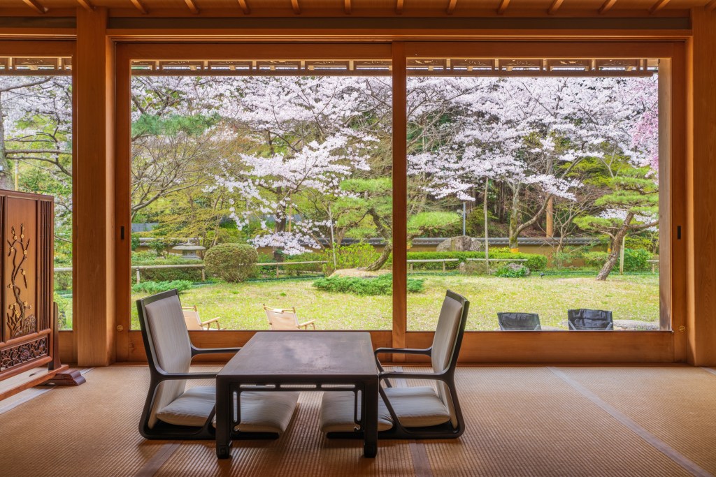 这座宛如古典画作的和风滨海别墅,坐拥俯瞰大海的广阔视角,不出家门也能观赏海上花火。入住这里的房客被森林和河流的自然之音包裹,可以清晰地感受时间从清晨到夜晚的变化。别墅内珍藏着由江户时代遗留下来的杉木雕刻而成的桌子与知名书法家绘制的屏风,为房客营造出富有和风气质的居住氛围。