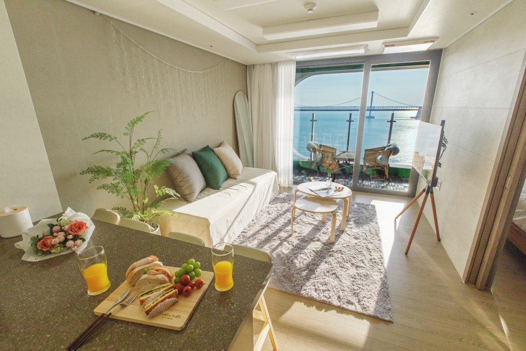 入住这间位于广安里海滩前的露台海景房,房客可在洒满阳光的室内,远眺釜山市地标之一“广安大桥”的壮观景色。步行即可到达的广安里海水浴场拥有细软的白色沙滩,海滩附近的民乐洞胡同街隐藏着许多风格独特的咖啡馆和餐厅,都是享受海滨疗愈时光不错的去处。