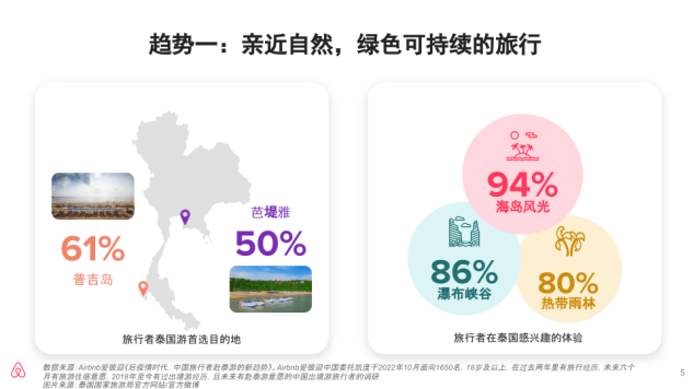 - 海岛(75%),山川/森林/瀑布等自然风光(74%)是中国旅行者最想前往的泰国目的地类型。