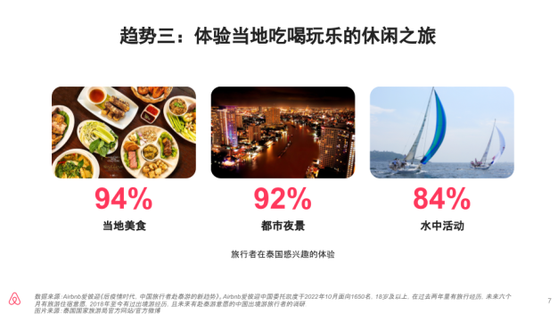 - 海岛风光(94%),瀑布峡谷(86%),热带雨林(80%)是中国旅行者最青睐的泰国体验。并且,受访的旅行者表示,相比疫情前他们对于这些体验的兴趣程度更高。