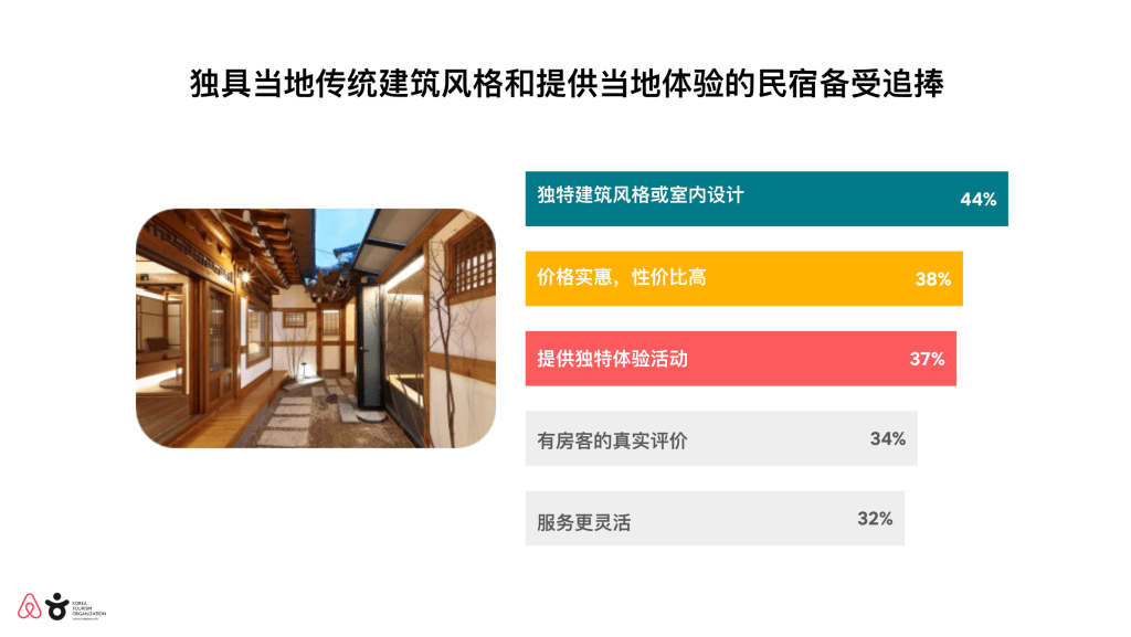 - 拥有独特建筑风格或室内设计(44%),性价比高(38%),以及能提供当地体验(37%)的民宿备受中国旅行者关注和青睐。