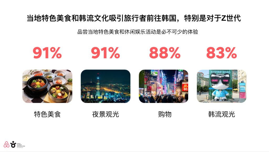品尝当地特色美食和休闲娱乐活动成为赴韩旅行者必不可少的体验。同时,以K-POP为代表的时尚潮流文化也在持续吸引着Z世代旅行者赴韩旅游。