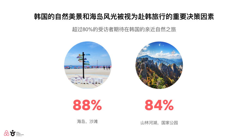 - 海岛风光(88%),山林河湖/国家公园(84%)是中国旅行者最想前往的韩国目的地类型。