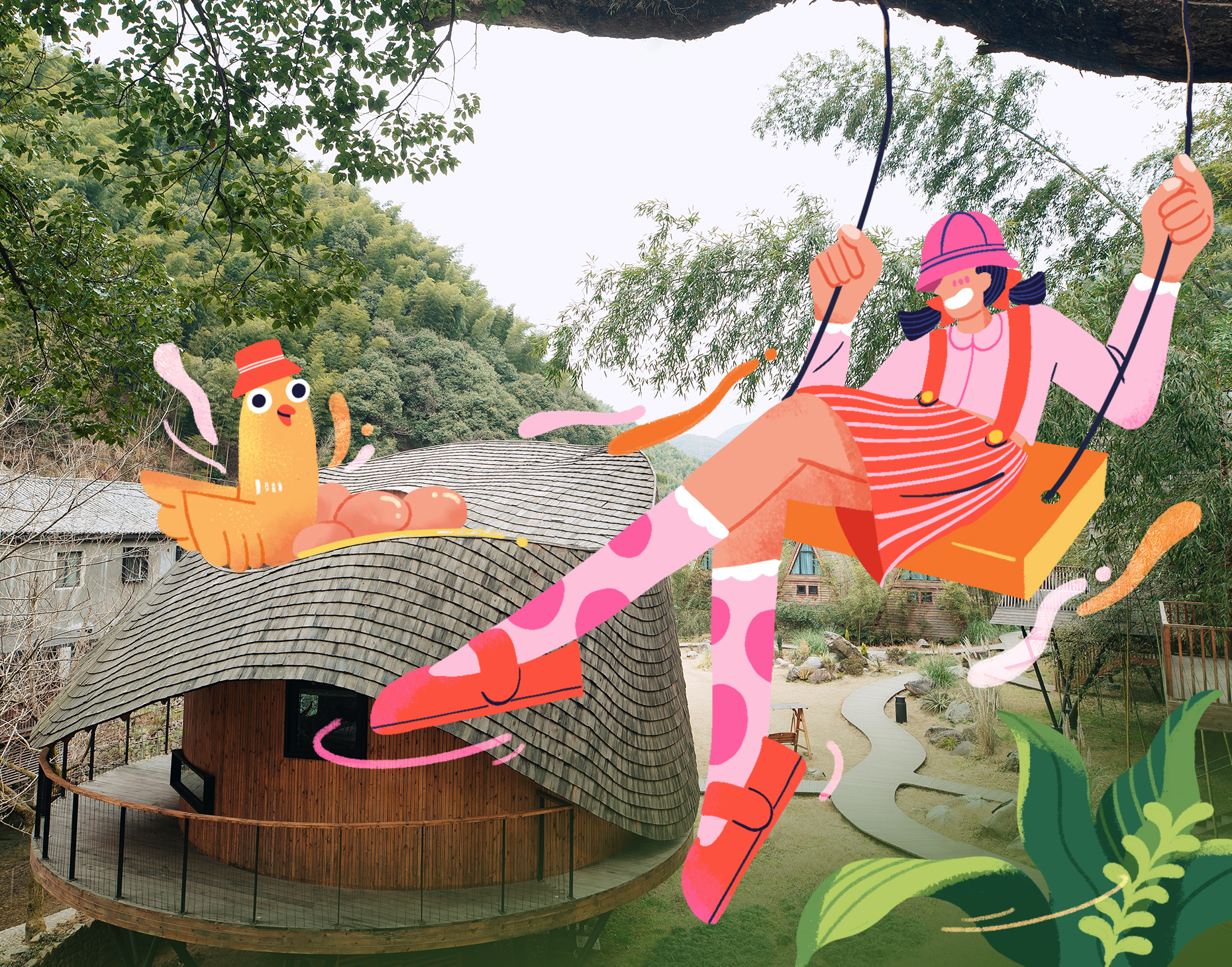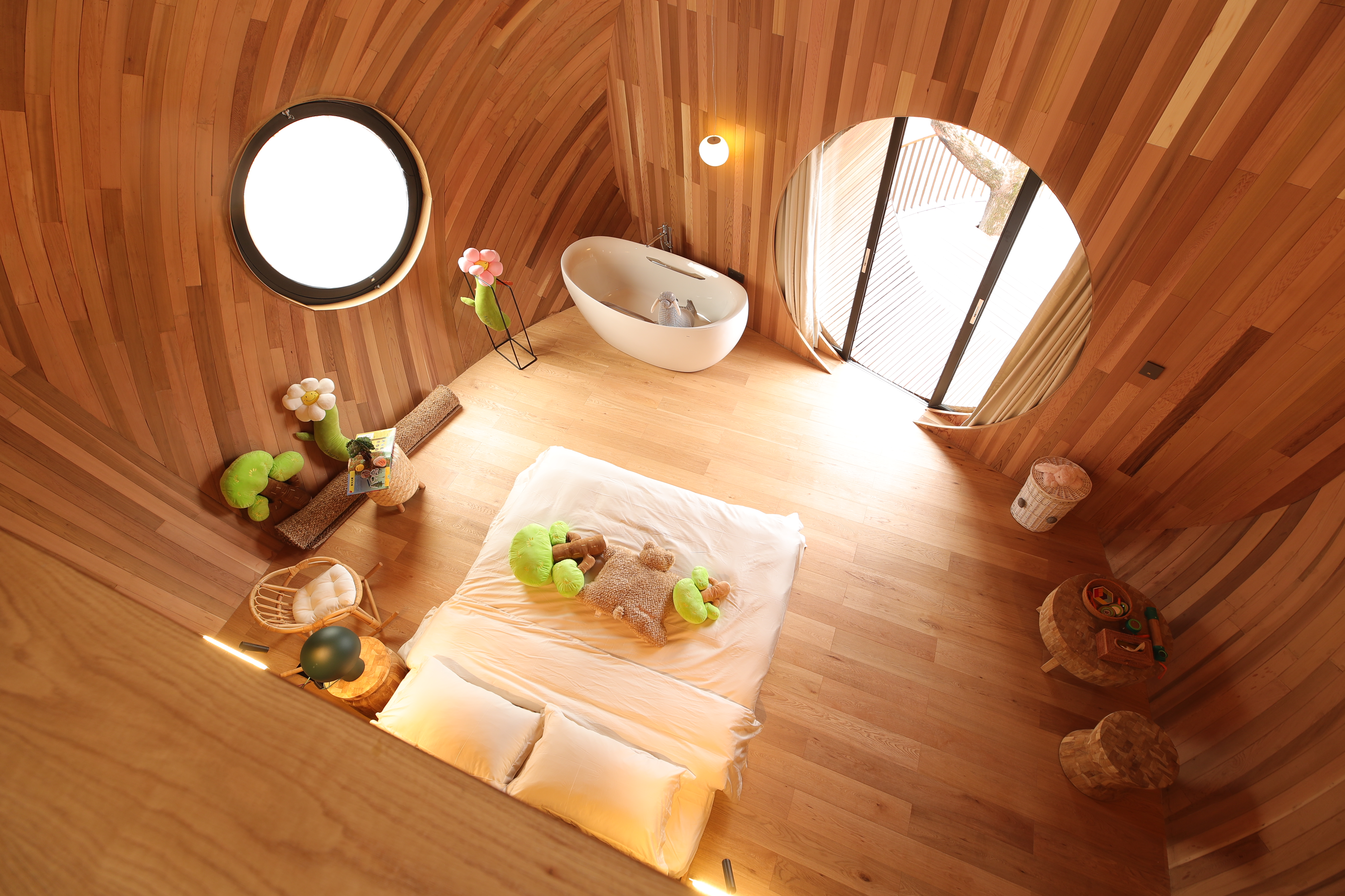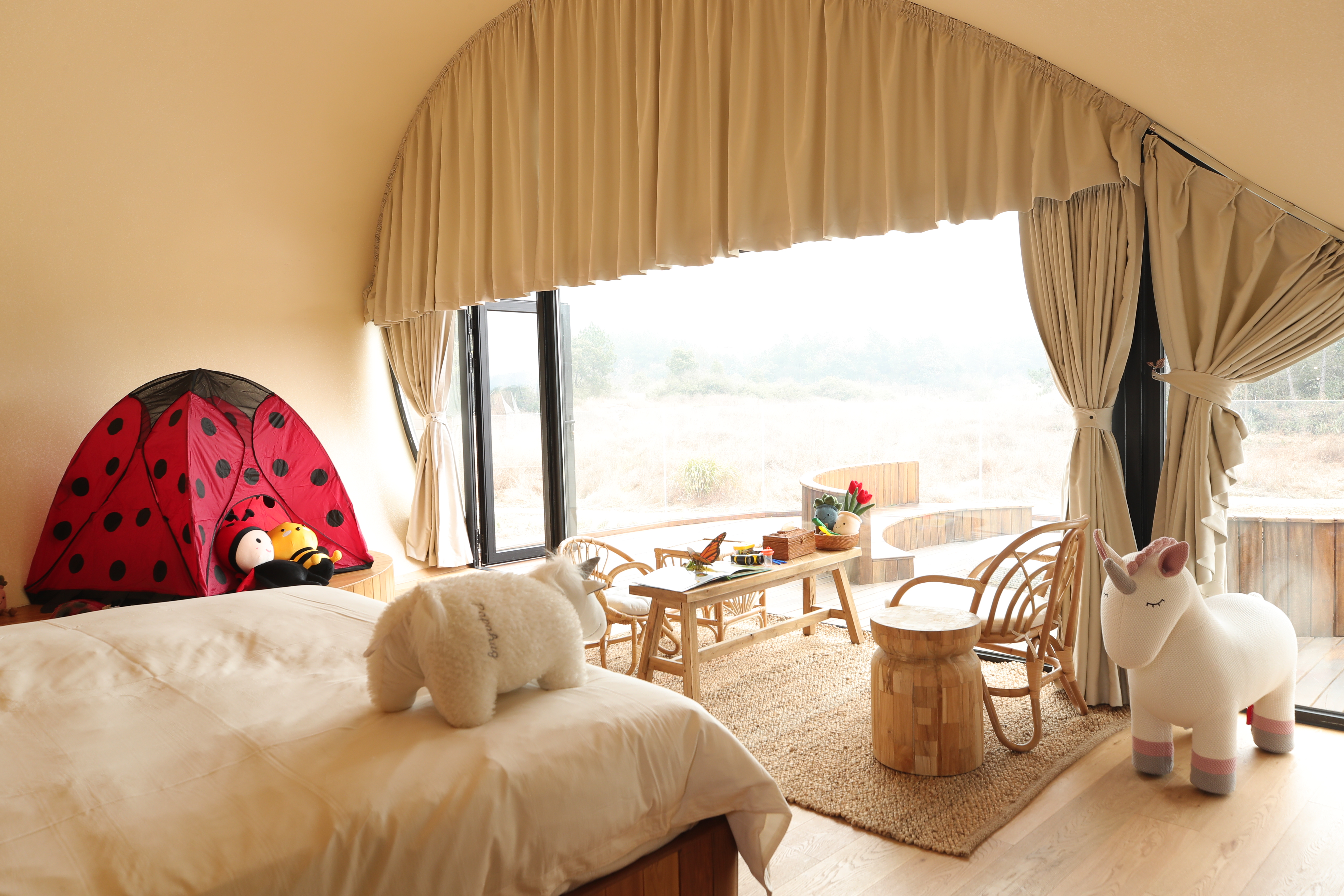 绿意环绕的鸟巢屋设计独特,看似柔软的屋顶勾勒出飘逸的天际线,从每扇窗户望出去都能看到一份独到的春景,让住进奇屋的你能尽情呼吸山涧的自然气息。你和孩子将在“鸟巢”里了解飞行的知识乐趣,启程一场“飞行奇遇记”,感受像鸟儿一样的自由时光。