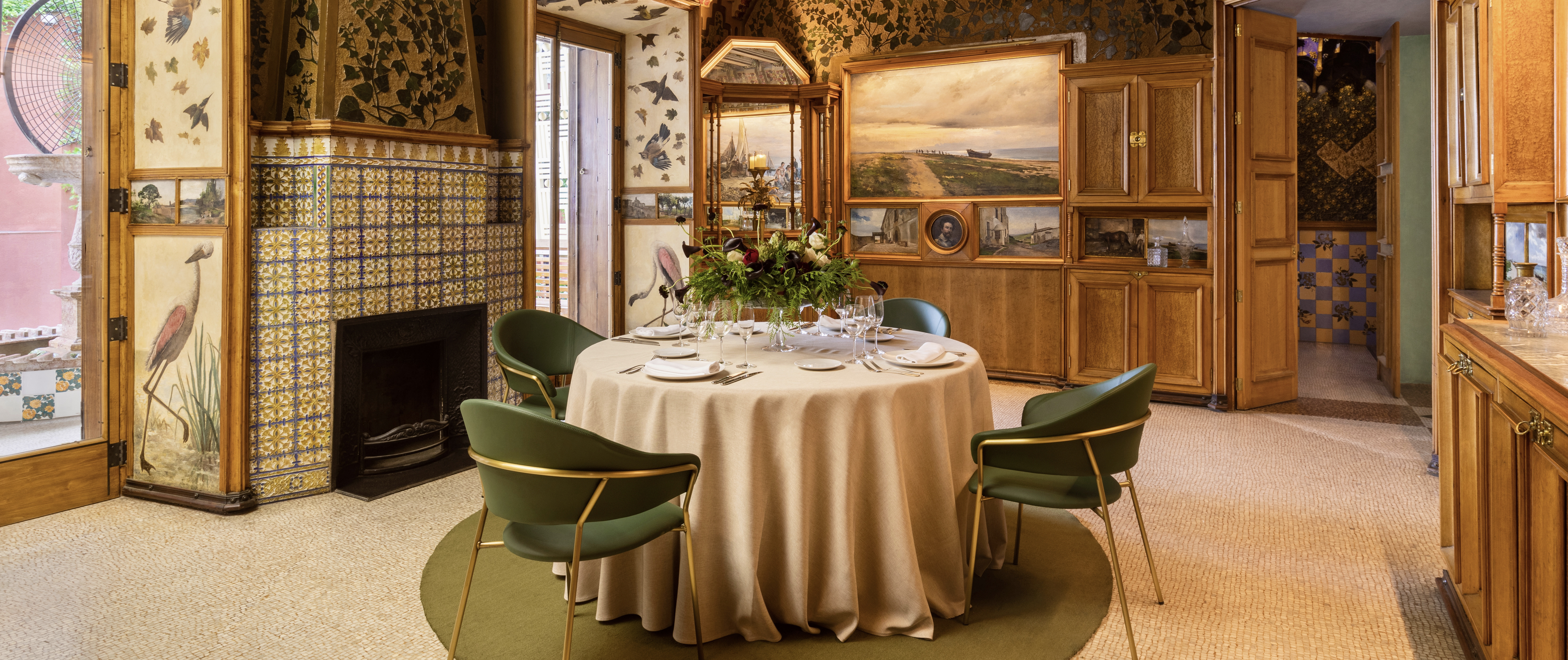 文森之家独特的建筑外墙花纹,搭配着花园中的地中海风情植物和墙面上的精美浮雕,彼此相连,互为呼应,让入住者在这里感受到艺术与建筑的完美共鸣。餐厅的设计也别具特色,从墙壁到壁炉一直到天花板,植物浮雕繁复延伸,包裹着精致的油画框,让浪漫与自然的魅力再次彼此交融。最负盛名的吸烟室也是一处不可错过的艺术美景,几何玻璃花窗华丽又迷幻,深蓝蜂巢天花板下,植物浮雕生机盎然,烟雾缭绕时,神秘感油然而生。